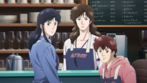 Wooper: I’ve seen the first few episodes of the original Cat’s Eye adaptation, and I have to say, this one suffers by comparison. The animation is better here (especially during the opening paraglider scene), but for character and color design, and even storyboarding, you’re going to want the 80s version. I was surprised by the remake’s poor performance in that last category, but perform poorly it did, botching an early “dodge the motion-detecting lasers” scene and occasionally placing the Cat’s Eye girls way too close to the cops for them to plausibly elude detection. Not that plausibility should be a major factor when deciding whether to watch this show, since it features the dumbest detective in animanga history, Toshio Utsumi. This poor schmuck somehow can’t make the connection between the three sisters running his favorite cafe (Cat’s Eye) and the identically named trio of art thieves responsible for his professional humiliation. On the plus side, modern touches like Toshio and Hitomi going on a rock climbing date or Ai’s use of her smartphone fit neatly within the context of the episode; if anything, the premise of Cat’s Eye makes more sense in our internet-enabled future than it ever did four decades ago.