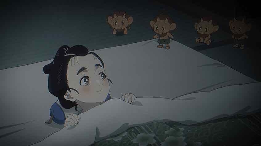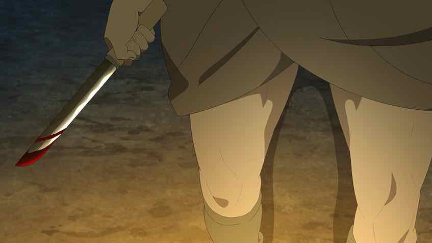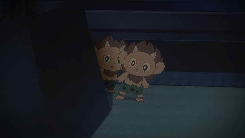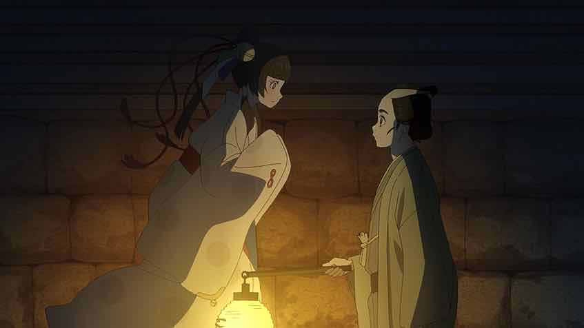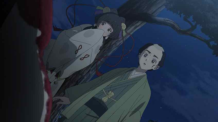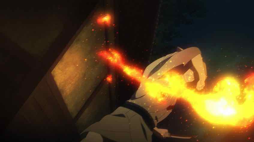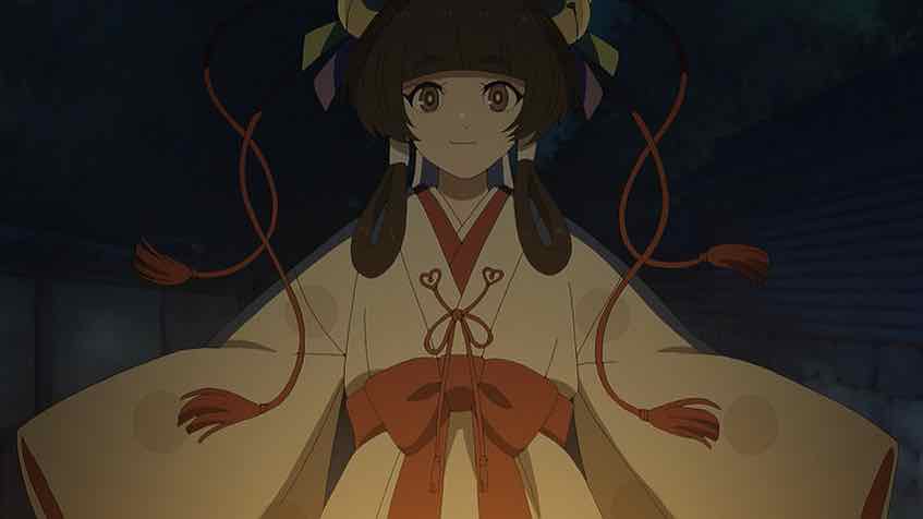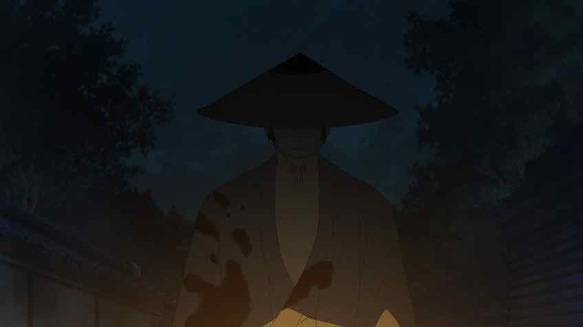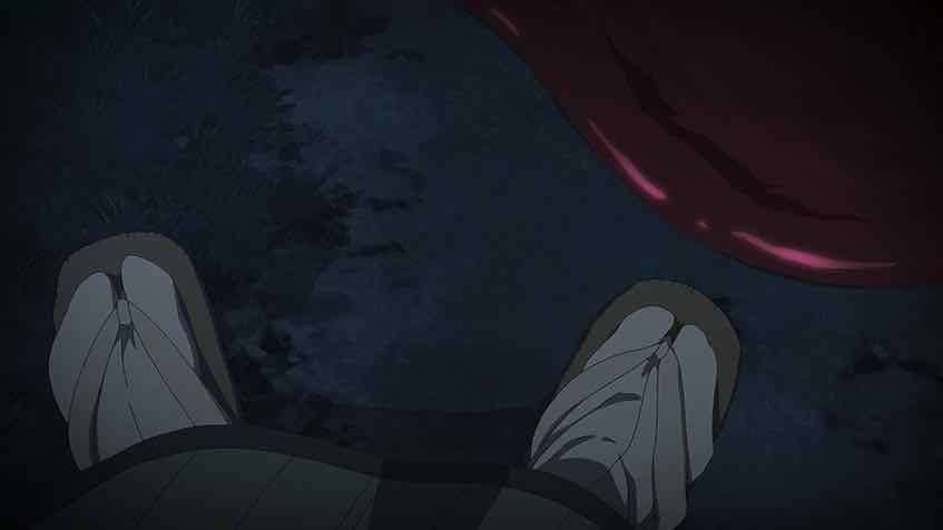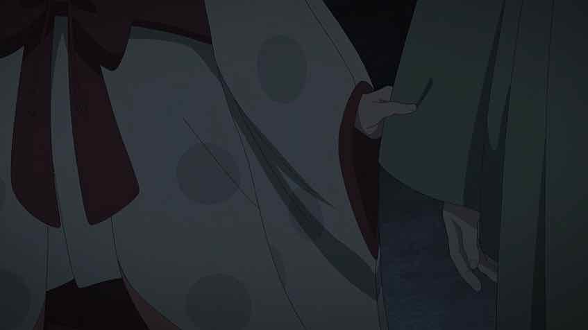 On one of these excursions – on a moonless night when Ichitarou is joined by a worried spirit messenger from the Inari shrine – he appears to stumble upon a murder scene. The culprit then appears, declares that something smells delicious and demands that it be handed over, and brandishes a bloody knife. Ichitarou bolts but obviously, intense physical exertion is not his strong suit. Eventually he’s forced to call for yet more spirit aid from the shrine – this time a Furaribi (traditionally a soul which has not passed to the other side), a fire spirit which flares to his defense. He escapes, but encounters a bloody corpse at the river’s edge.