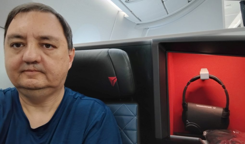 For my ninth, I think, trip to Tokyo I was going with former AnimeNation web-monkey Phil, who was visiting Japan for the first time. On the morning of Sunday, September 21, 2025, I drove us to Tampa International Airport’s economy parking lot. We carried our baggage, me, a plastic footlocker with a duffle-bag inside and a carry-on backpack, Phil, a duffle bag with a second bag inside, to the Delta check-in counter. After we checked in and headed toward the security screening, we looked at our seat assignments and realized that thanks to Phil’s elite traveler status and the international flight being less than full, my seat had been upgraded to the highest tier “Delta One” accommodation. So we sat beside each other on the domestic flight from Tampa to Minneapolis, then in-line with each other for the trans-Pacific flight. The Delta One compartments are practically comparable to Japanese capsule hotel accommodations. Each personal compartment includes a personal video screen, noise-canceling headphones, a small shelf space, and a seat that can recline to a fully horizontal bed, complete with pillow and blanket.
