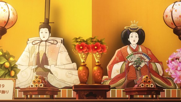 We open with a shot of our protagonist’s beloved hina dolls. These dolls are constructed for display on Hinamatsuri or “Girls’ Day,” wherein young girls are celebrated alongside their traditional dolls. Seems clear we’re going to get into the gendered expectations attendant in various hobbies – not only are hina dolls considered a “girl thing,” but their very format as a vision of the emperor and empress implies a reification of gender norms