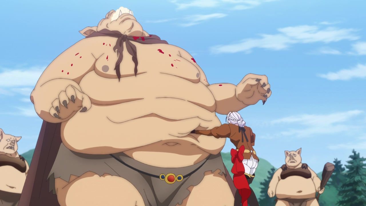 When we finally get to the evil invading armies, it’s still just fewer dudes than it’d take to form a dance flash mob, in a random field in the middle of nowhere. Which are instantly dispatched by the protagonist, because of course they are. At least they’re being consistent from the previous episode where the evil armies were also about seven dudes with pitchforks. Oh, but the evil super orc with super regenerating powers is here to stop her. Look at how drooly and rapey he is. She’ll have to dig deep into her… nope, she just says she’ll punch him again, does, and that wins the day. The entire invasion has been thwarted. Thanks to a long strategy meeting and punching a couple dudes four times. Maybe next week I’ll just look at screencaps and try to make something up. It’d almost certainly end up better written than this.
