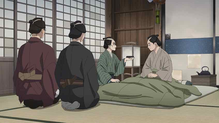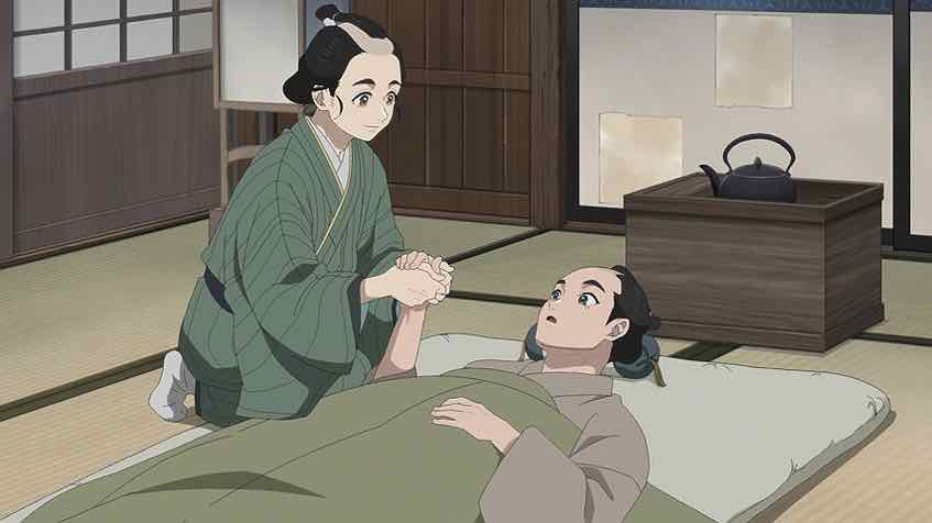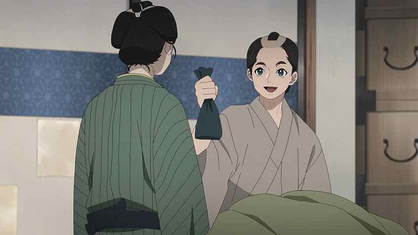 Yes, Waka-dono’s scent was the key to everything. As I surmised he is, in effect, the medicine the failed tsukumogami seeks. He’s pretty much figured all this out by the end of his visit to Eikichi, though the details will come later. Ichi is such a noble soul, seriously. He guilts his father into sending the family doctor – who Eikichi’s parents could never afford – to treat his friend. If  he has to bear being treated like bone china, at least he’s learned how to leverage that into getting what he wants. Small consolation but not nothing.