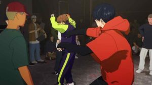 Fortunately for Kabo, there’s a “comeback round” – a kind of loser’s bracket where anyone who was cut can enter a last-chance cypher with one more spot available. Iori gives Kabo some sage advice not to get caught up in the rhythm of the try-hards and just be himself, and Kabo secures the precious spot. He’s still feeling a bit overawed by how easily this seems to come for Wanda, and when her turn comes for a one-on-one he finds himself jealous of the kid (the one from his block) who gets to dance with her. And get toasted by her…