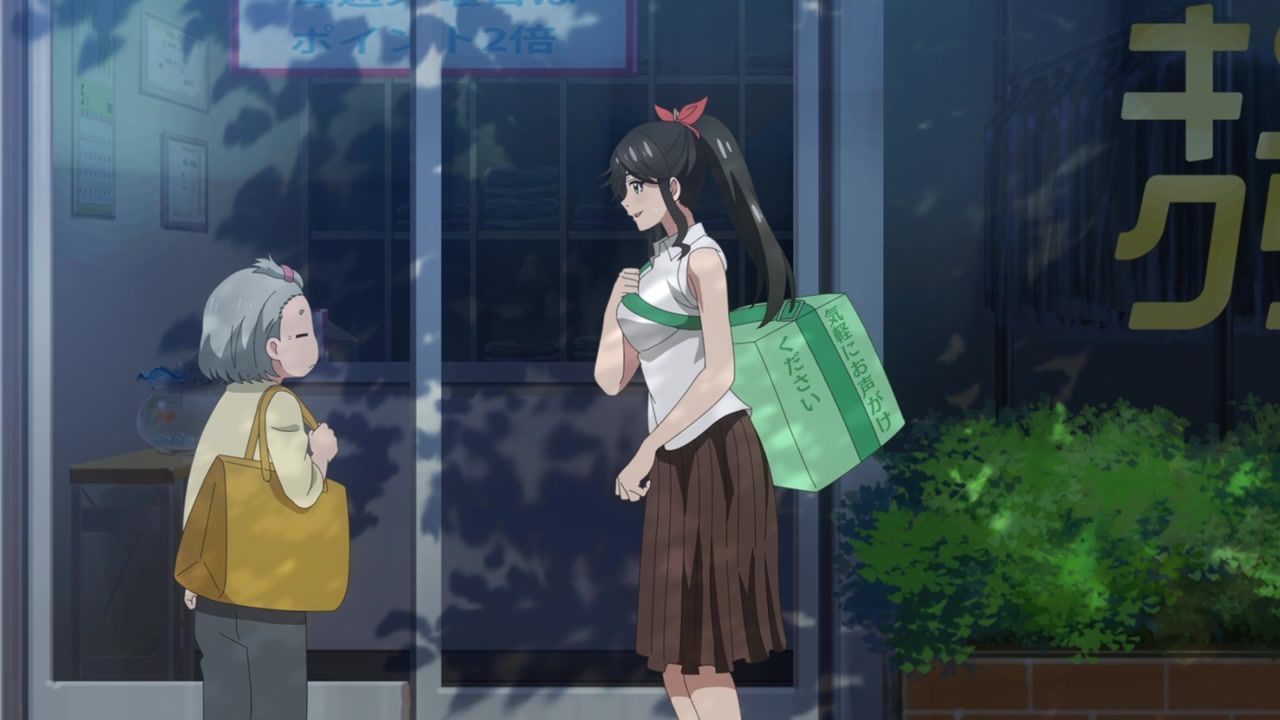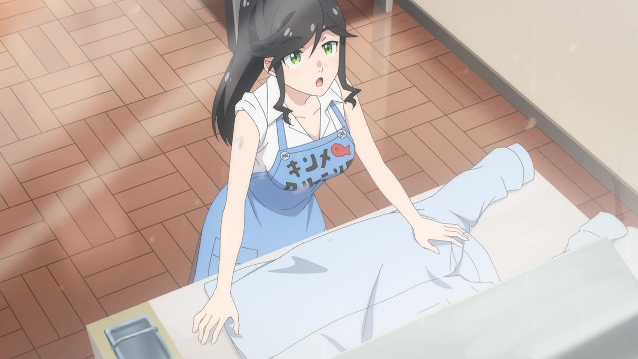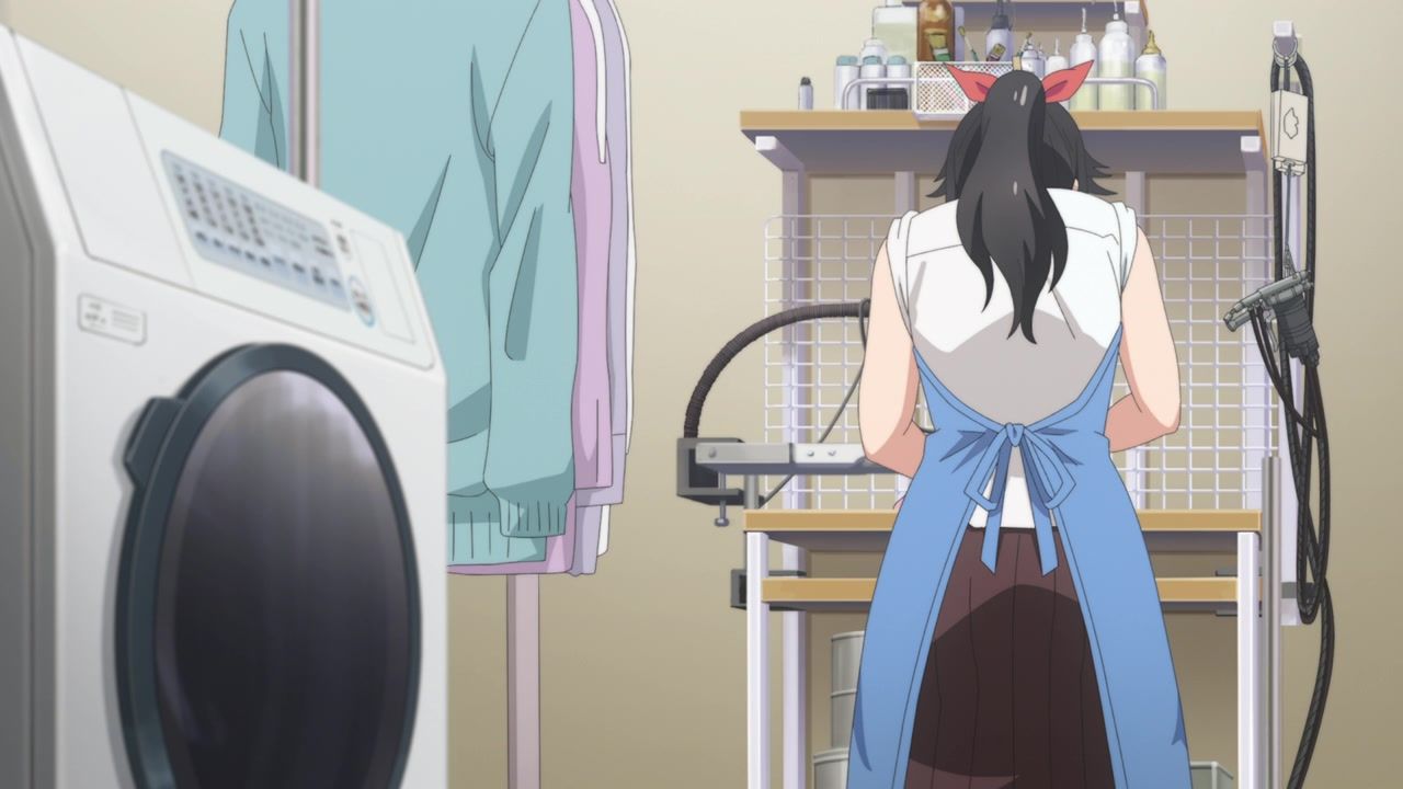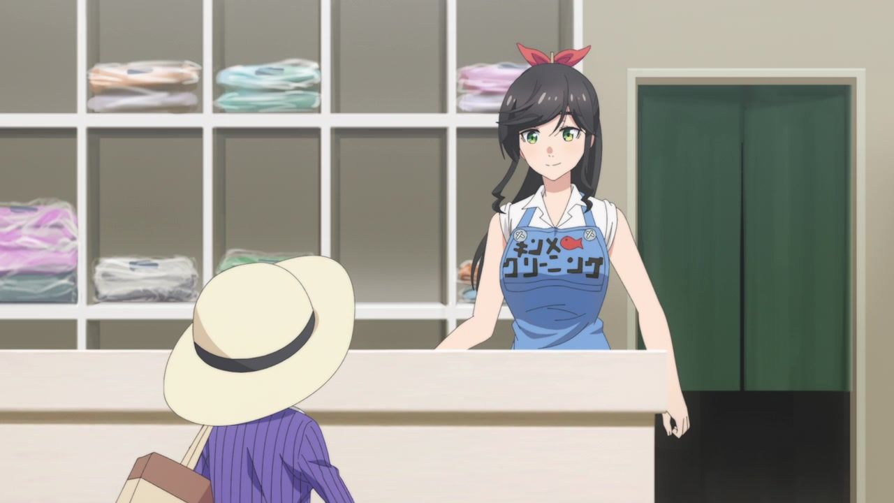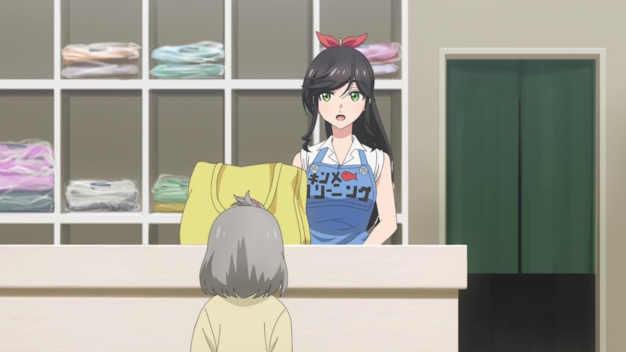 It certainly is what the kids call “slice of life.” No story, no comedy, just soporific music while an unnaturally chipper lady goes about doing laundry. Other than the obvious, it’s innocuous enough, I guess, but I still don’t see the point. In one ear, out the other, pretty literally since it loves to do montages of random town scenery to pad out scenes. What is there to say or even hope for with the show? That she gets with the kid? That next week has slightly different music and maybe it rains? At least she didn’t yell a lot.