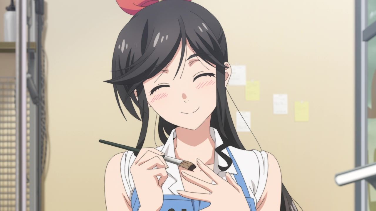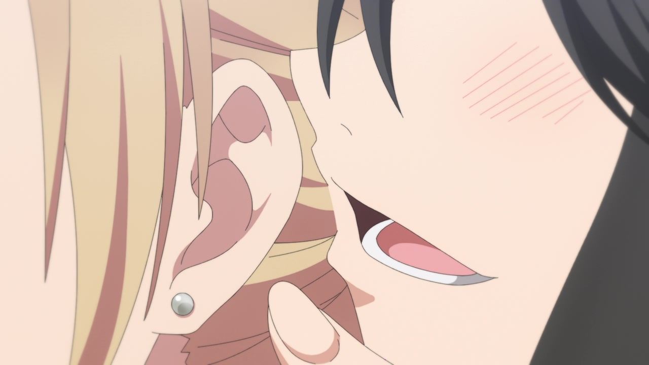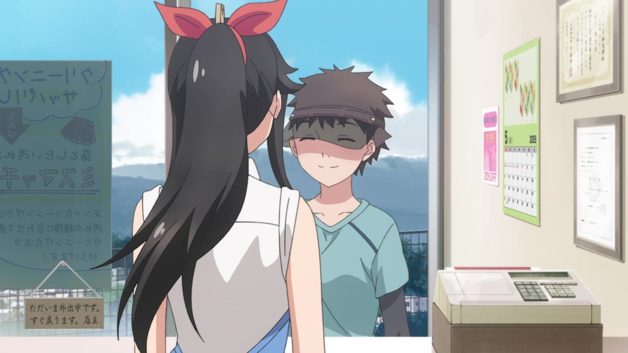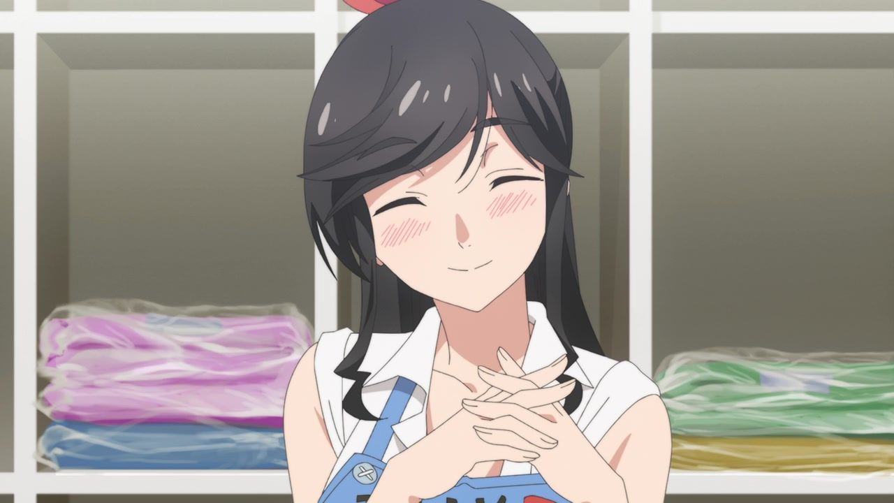 Yep. Certainly what I got from the manga. Random people stop by to announce what a well-adjusted and happy person she is, so she can smile and say “golly gee.” Or my favorites, the ones who show up to announce her backstory. I know when I go to the dry cleaner, the small talk I have with them is “Wow, you started this store two years ago, right? It sure has been two years.” The highlight of her day is when she runs into the local highschool boy so she can flirt with him. And go all out there. On her hands and knees, fixing his clothes, and then pulling down her apron so she can bend over and give him a full view of her cleavage. Not making the most convincing argument for just an innocent happy little show to end things. Also pretty certain half his lines were “Um” and “Uh.”