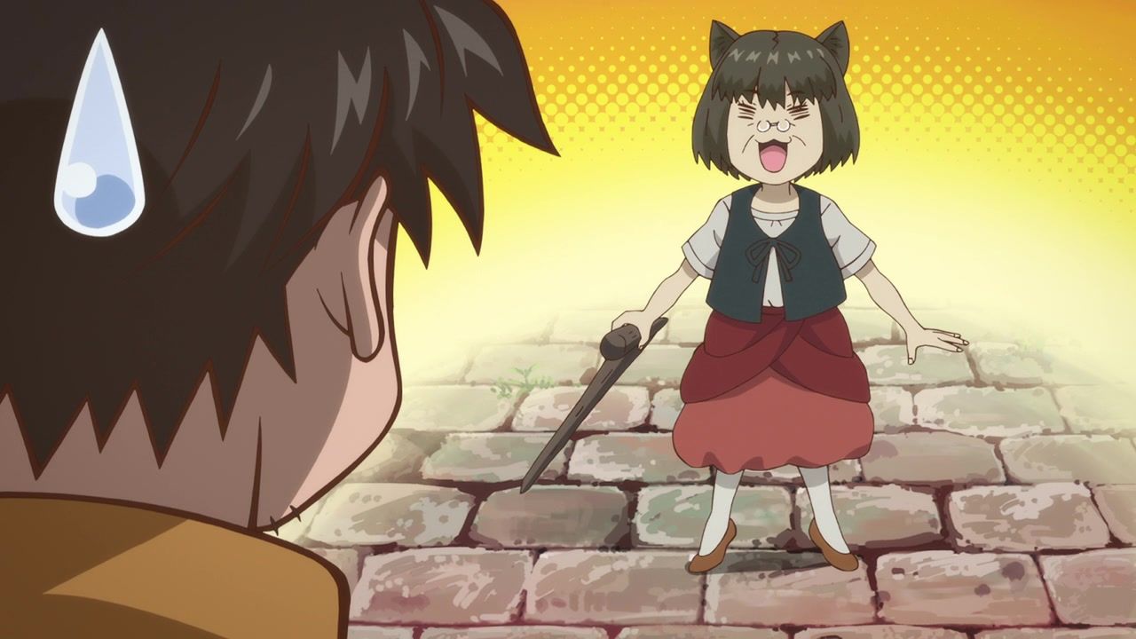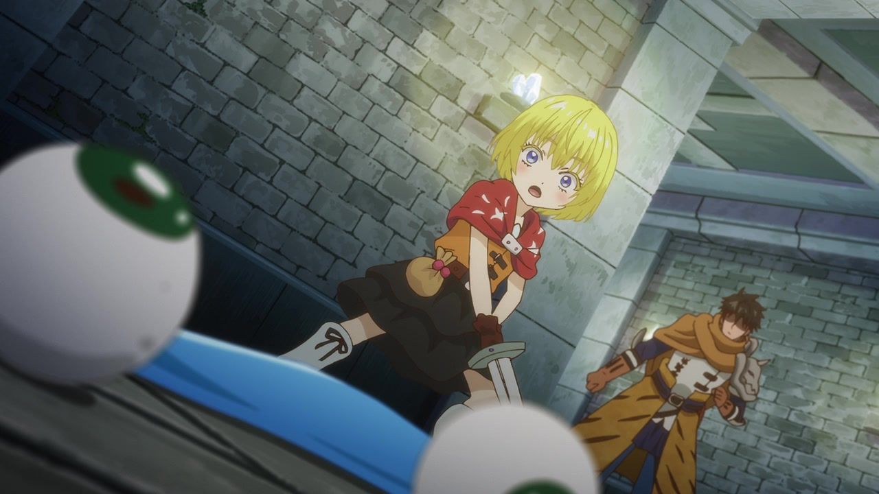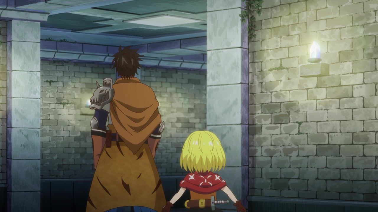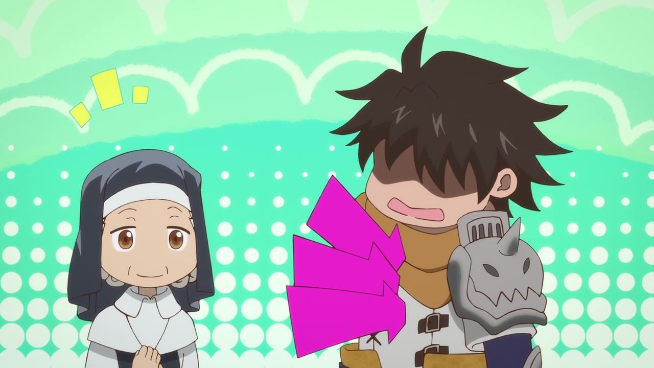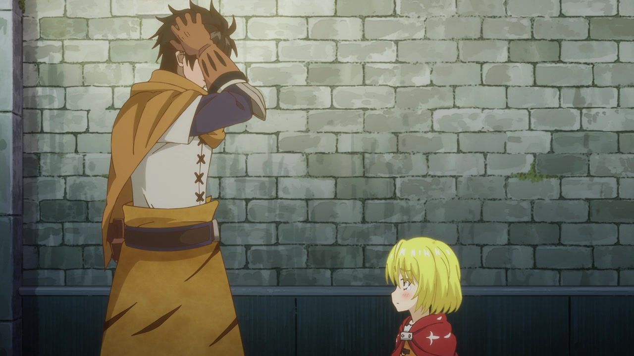 Oh, it starts out with his rags to riches story, but by 90 seconds into the episode, he’s the toast of the town which they explain, and the sole Good Adventurer, which they explain despite there not being any Bad Ones, and the local dungeon is more like an office building where you’re meant to clock in and out, so on and so forth. About the time they felt the need to explain the concept of orphanages was where my brain had totally atrophied. Admittedly, longer than usual. Perhaps the first minute jolted me into considering that maybe this would be slightly more serious than it looked. Or maybe it was the child violence and unneccesary peeing making me question existence in general. Plenty of overreaction yelling as ‘comedy’ certainly got rid of that even before the pointless exposition finished the job.