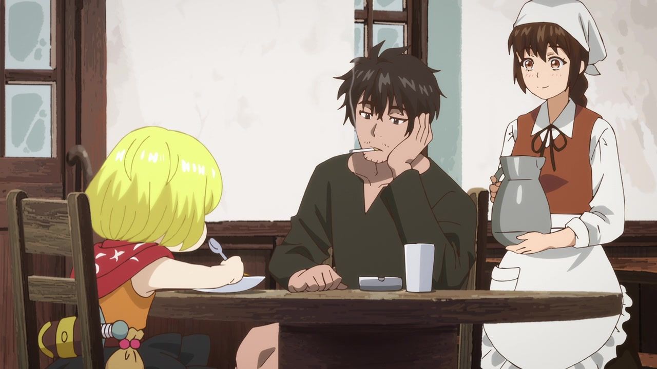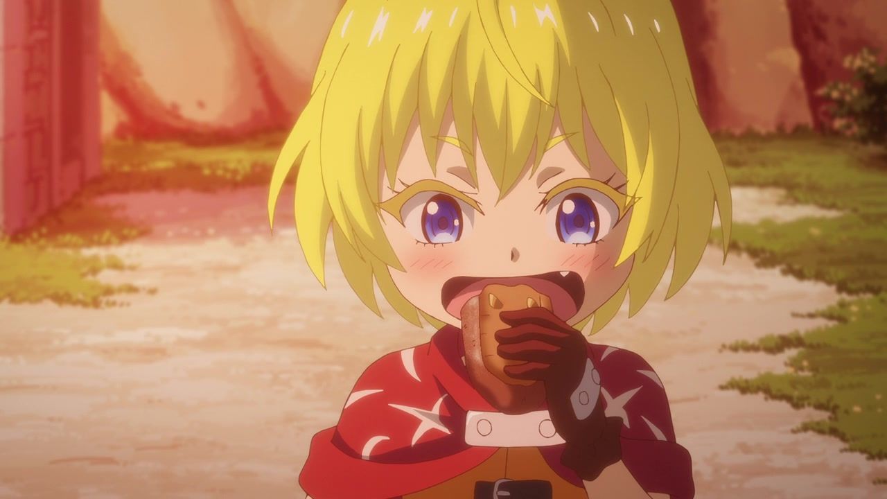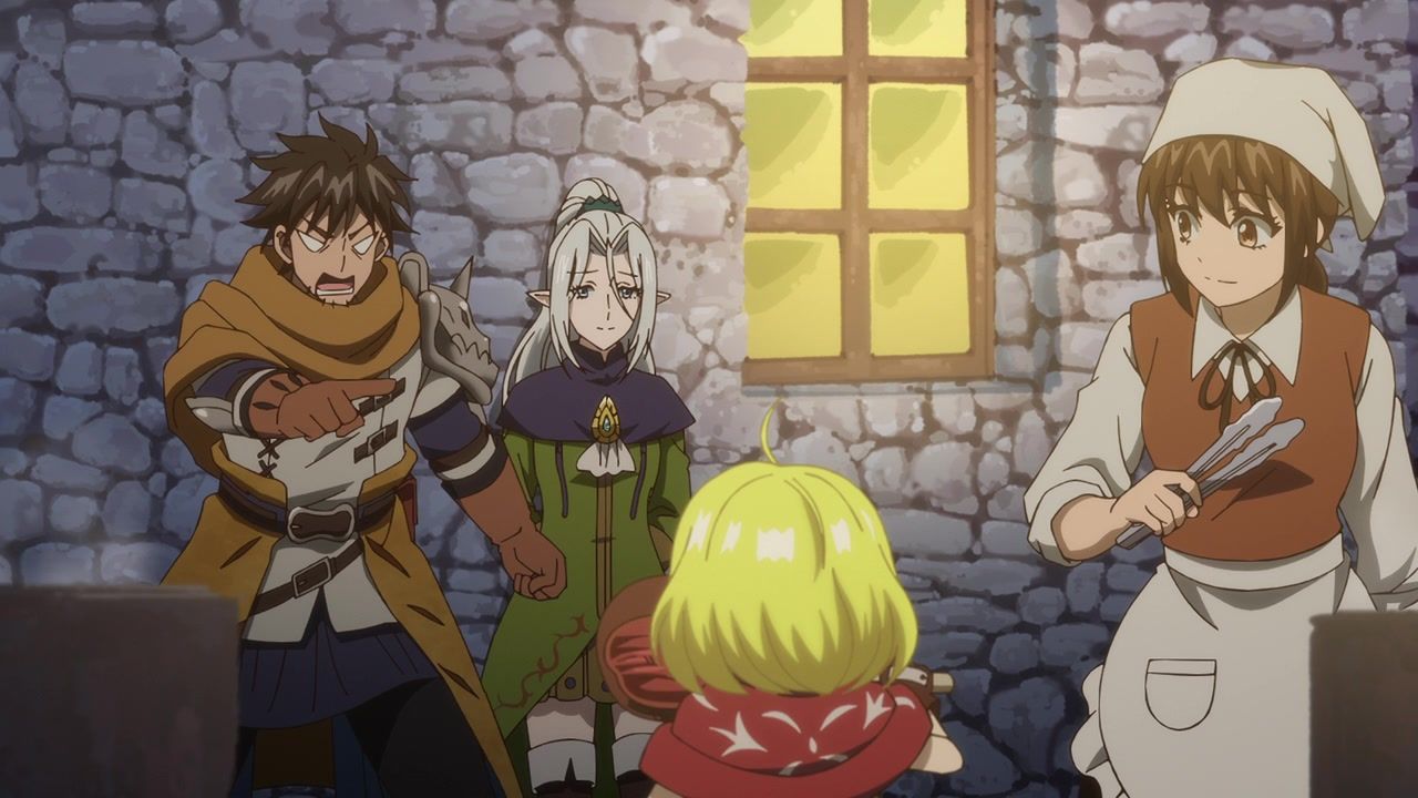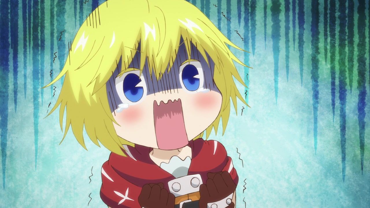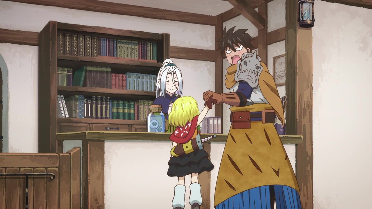 Oh, it starts out with his rags to riches story, but by 90 seconds into the episode, he’s the toast of the town which they explain, and the sole Good Adventurer, which they explain despite there not being any Bad Ones, and the local dungeon is more like an office building where you’re meant to clock in and out, so on and so forth. About the time they felt the need to explain the concept of orphanages was where my brain had totally atrophied. Admittedly, longer than usual. Perhaps the first minute jolted me into considering that maybe this would be slightly more serious than it looked. Or maybe it was the child violence and unneccesary peeing making me question existence in general. Plenty of overreaction yelling as ‘comedy’ certainly got rid of that even before the pointless exposition finished the job.