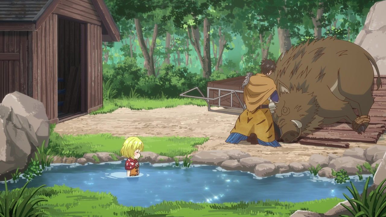 The promos, and the manga for that matter, hide the creepy fanservice angle a bit, but the anime has decided on a different tack, revealing it right away and talking up how big her boobs are. At least we won’t have to suffer through any illusions that it’s just an innocent child rearing thing. With copious amount of child beating and child peeing herself. Which are still better jokes than the primary content of the episode, which is the same as all these damn things; tutorialized exposition about how much like an RPG world the setting is.