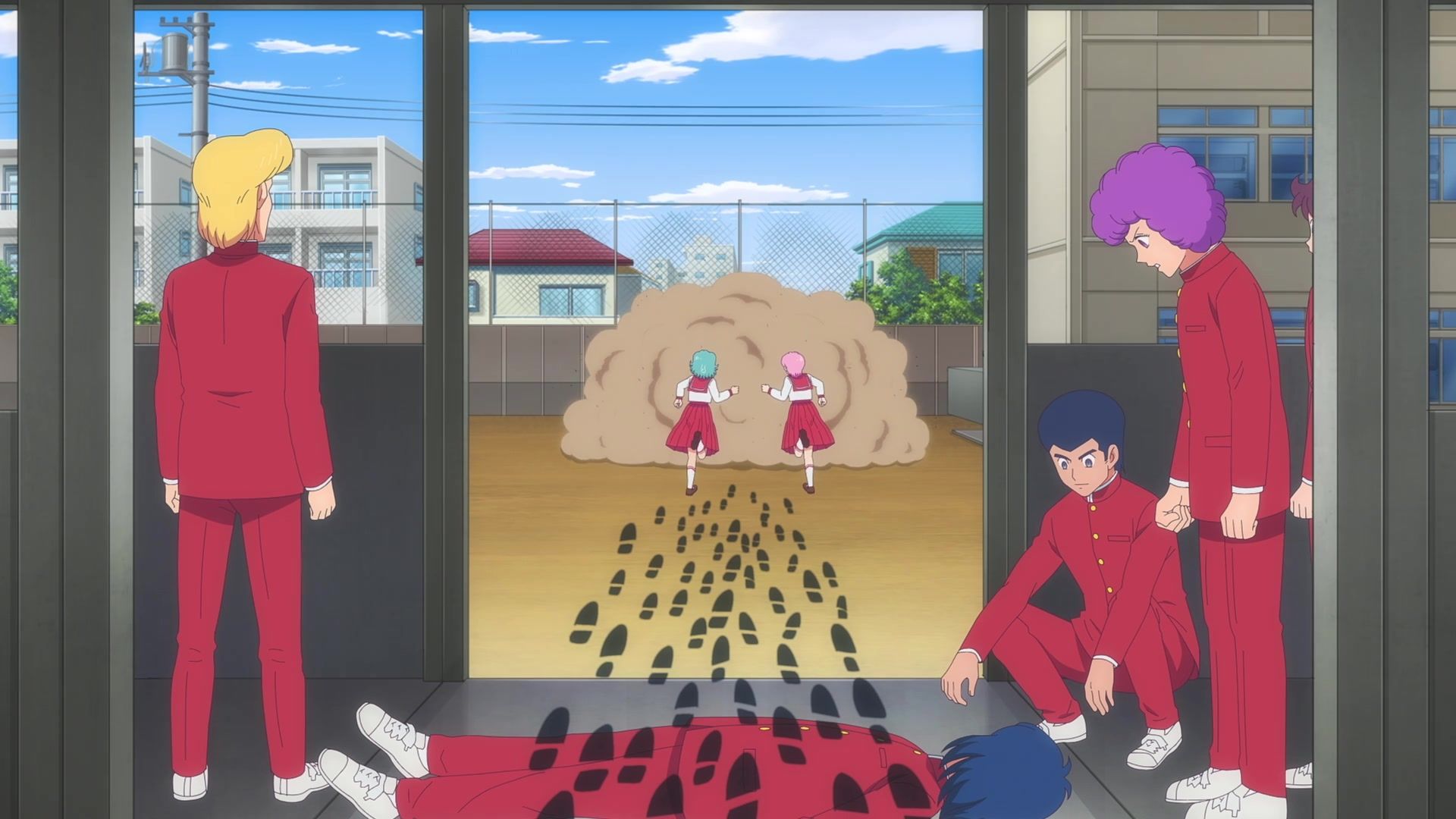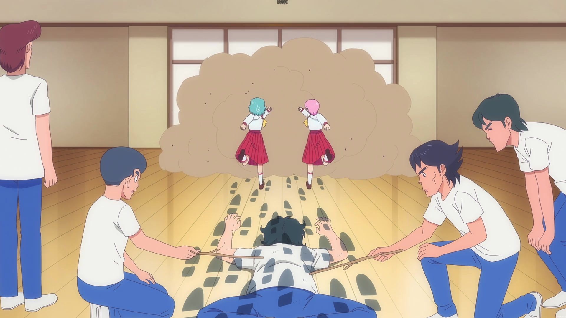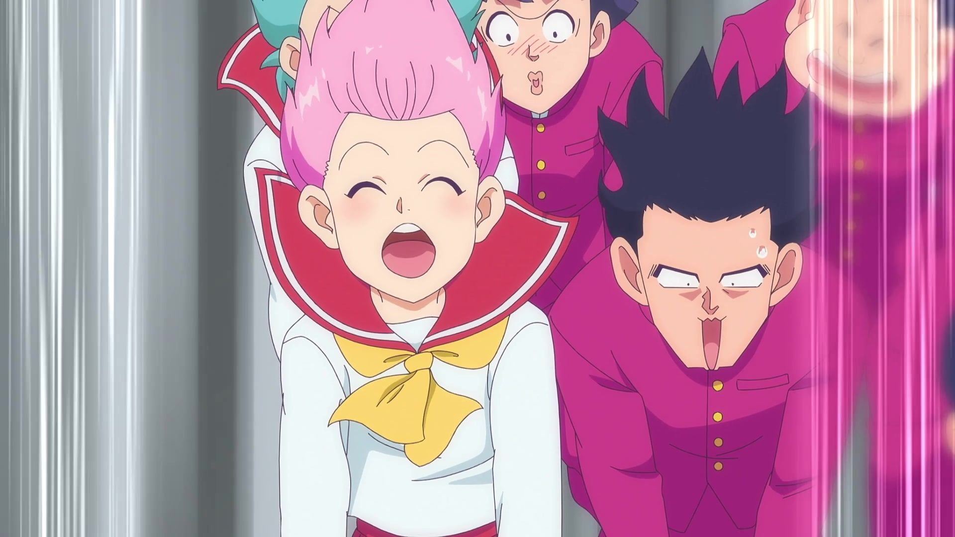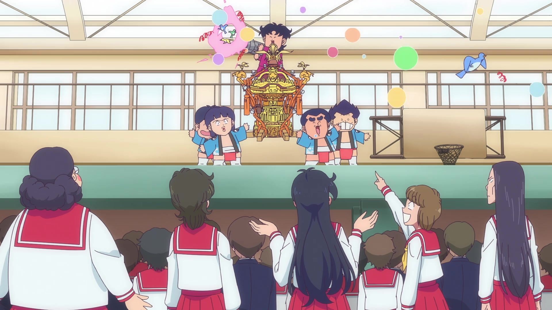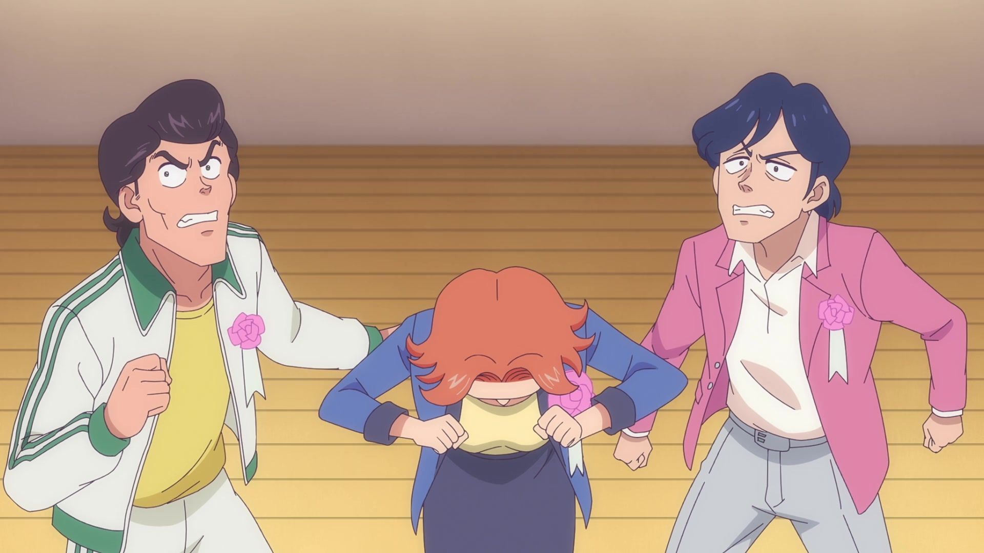It’s certainly trying to bring back the 80s, which seems to be noitaminA’s side project lately, much more than the recent Urusei Yatsura revival. Especially the character designs. Everyone has giant poofy hair, chins like a ton of bricks, and eyes that are either way too large or way too small with no in-between. There’s just one little rap at the start and then it’s entirely 80s, right down to the animators snorting a terrifying amount of cocaine. I think they were afraid of anybody accusing this show of not being chaotic enough. Or loud enough for that matter. There’s a throughline of characters yelling the entire episode. Not even always as reaction to anything, simply yelling to yell. The existence of silence displeases god… or something.