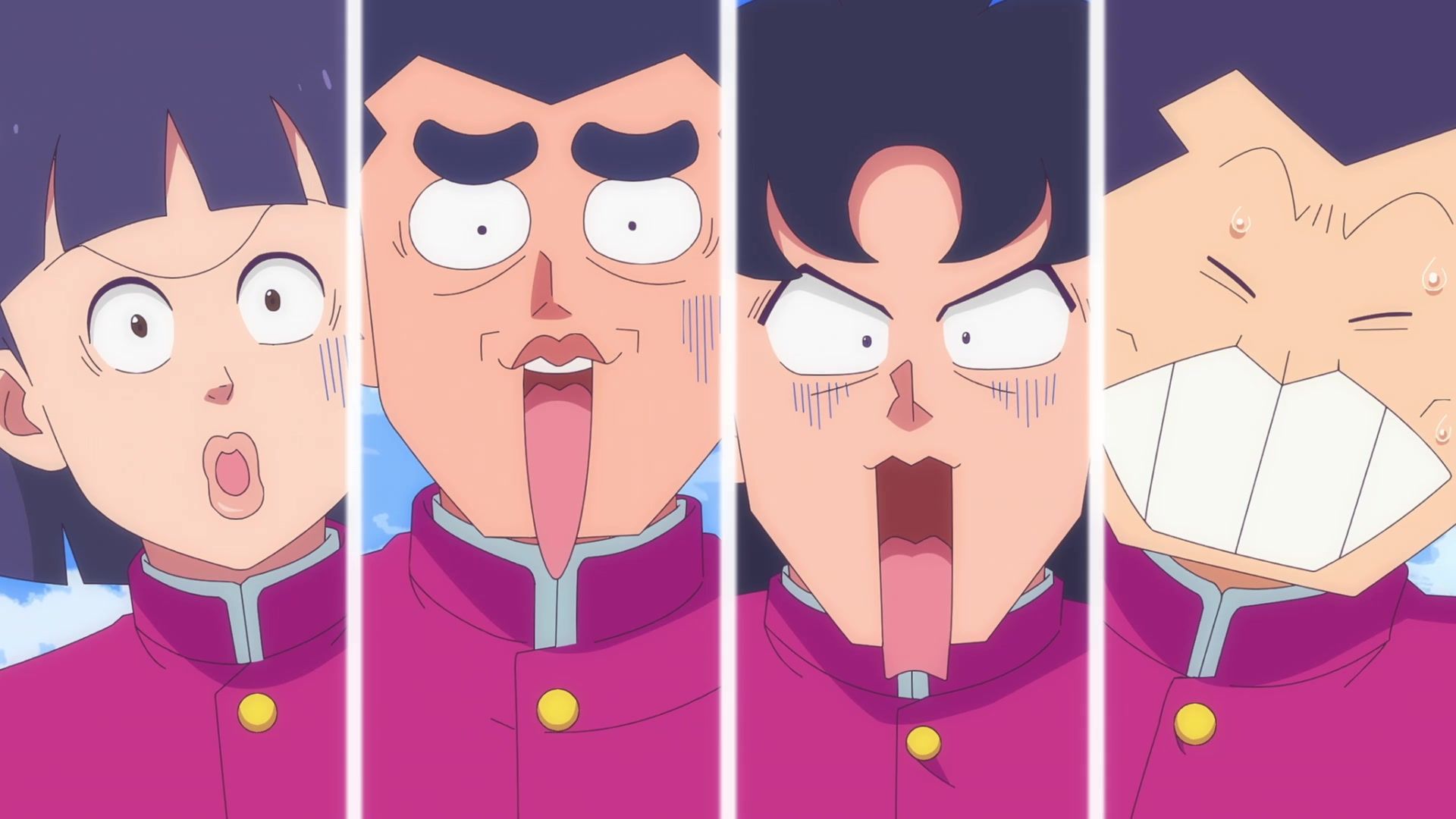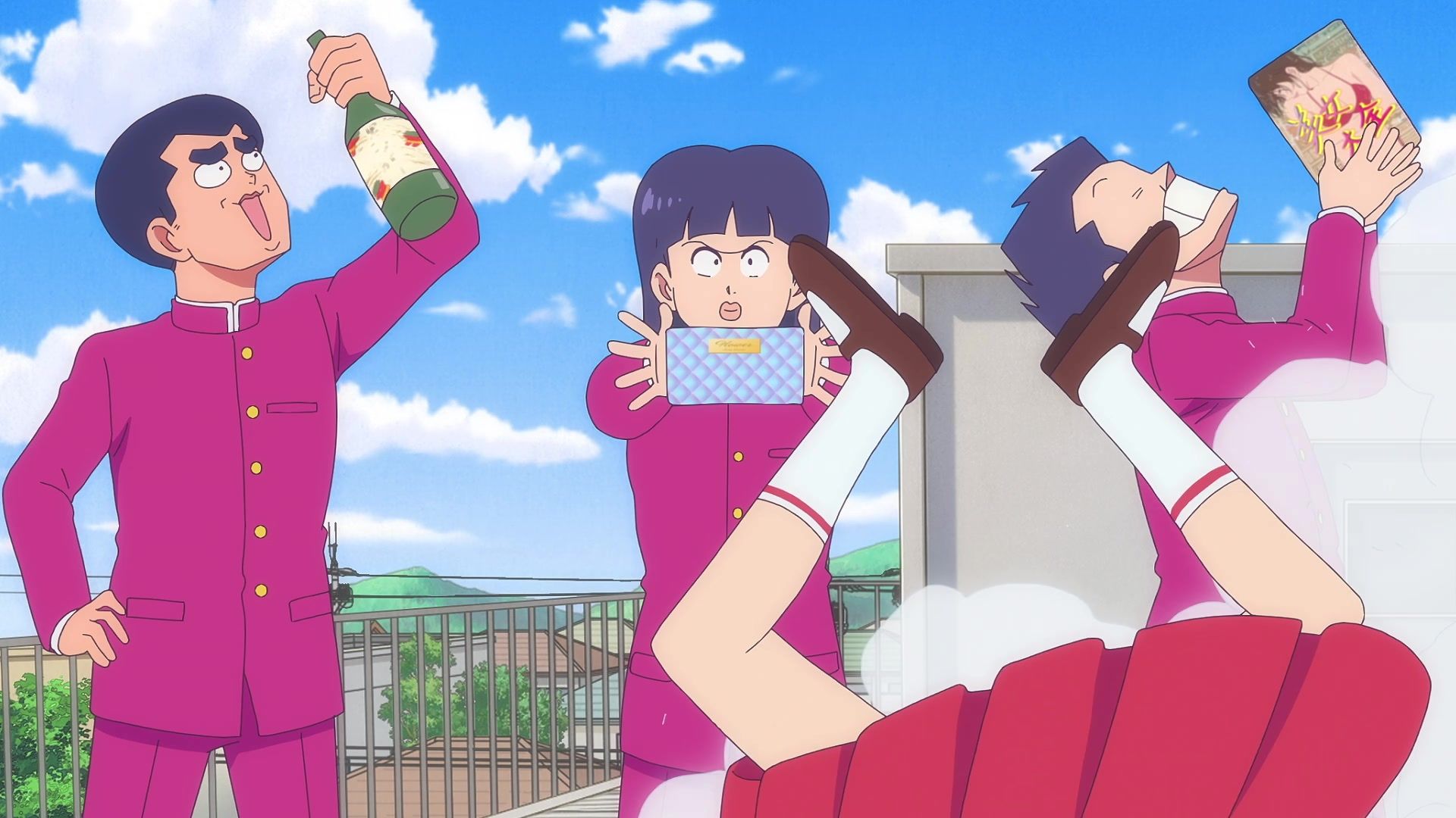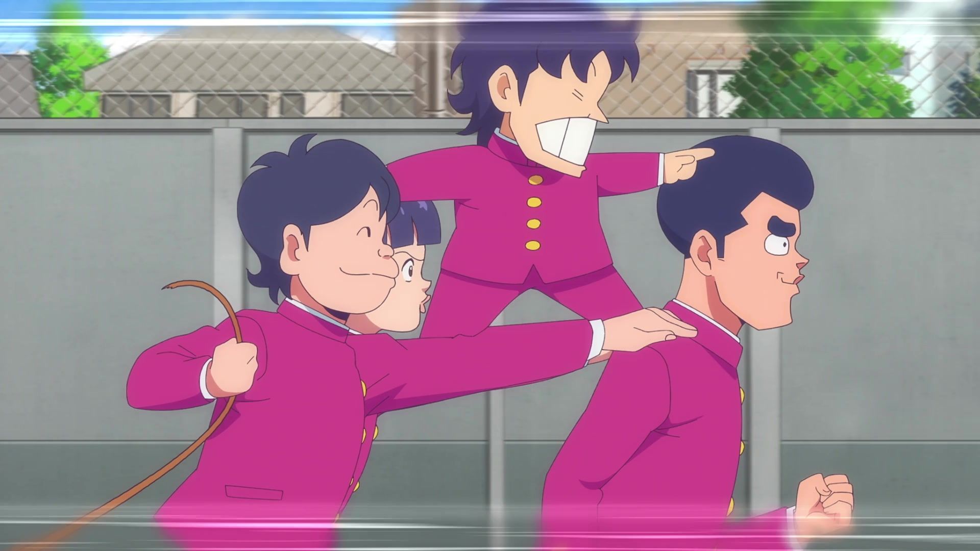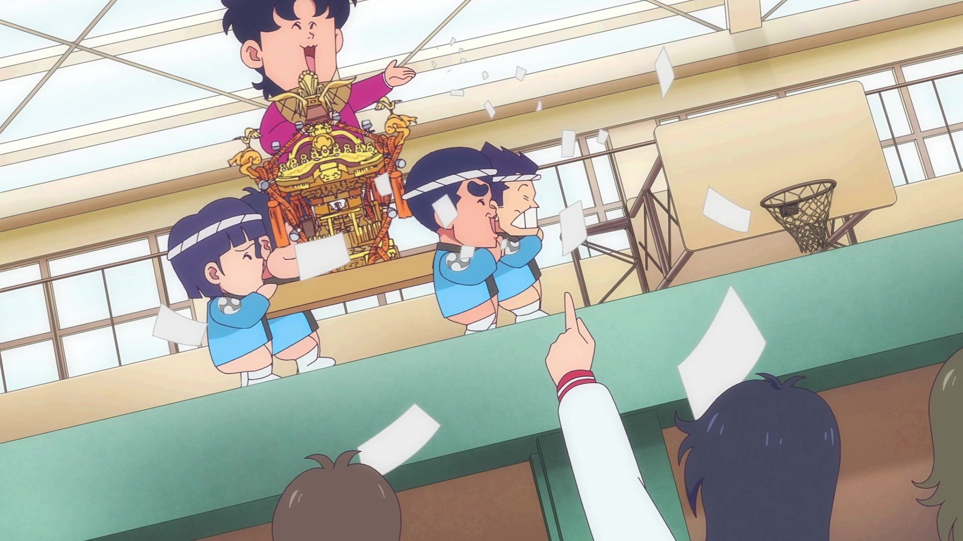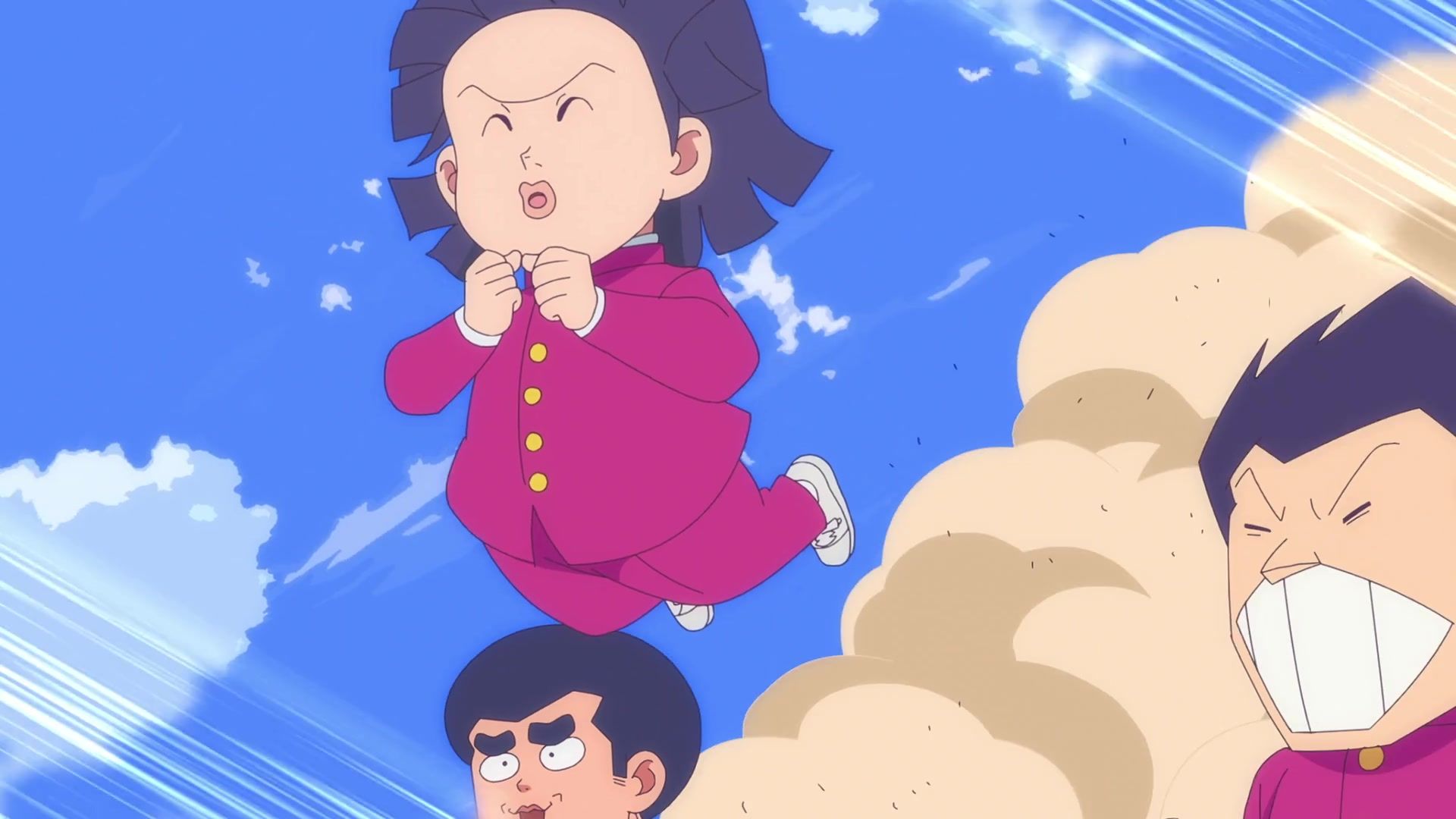 It’s certainly trying to bring back the 80s, which seems to be noitaminA’s side project lately, much more than the recent Urusei Yatsura revival. Especially the character designs. Everyone has giant poofy hair, chins like a ton of bricks, and eyes that are either way too large or way too small with no in-between. There’s just one little rap at the start and then it’s entirely 80s, right down to the animators snorting a terrifying amount of cocaine. I think they were afraid of anybody accusing this show of not being chaotic enough. Or loud enough for that matter. There’s a throughline of characters yelling the entire episode. Not even always as reaction to anything, simply yelling to yell. The existence of silence displeases god… or something.