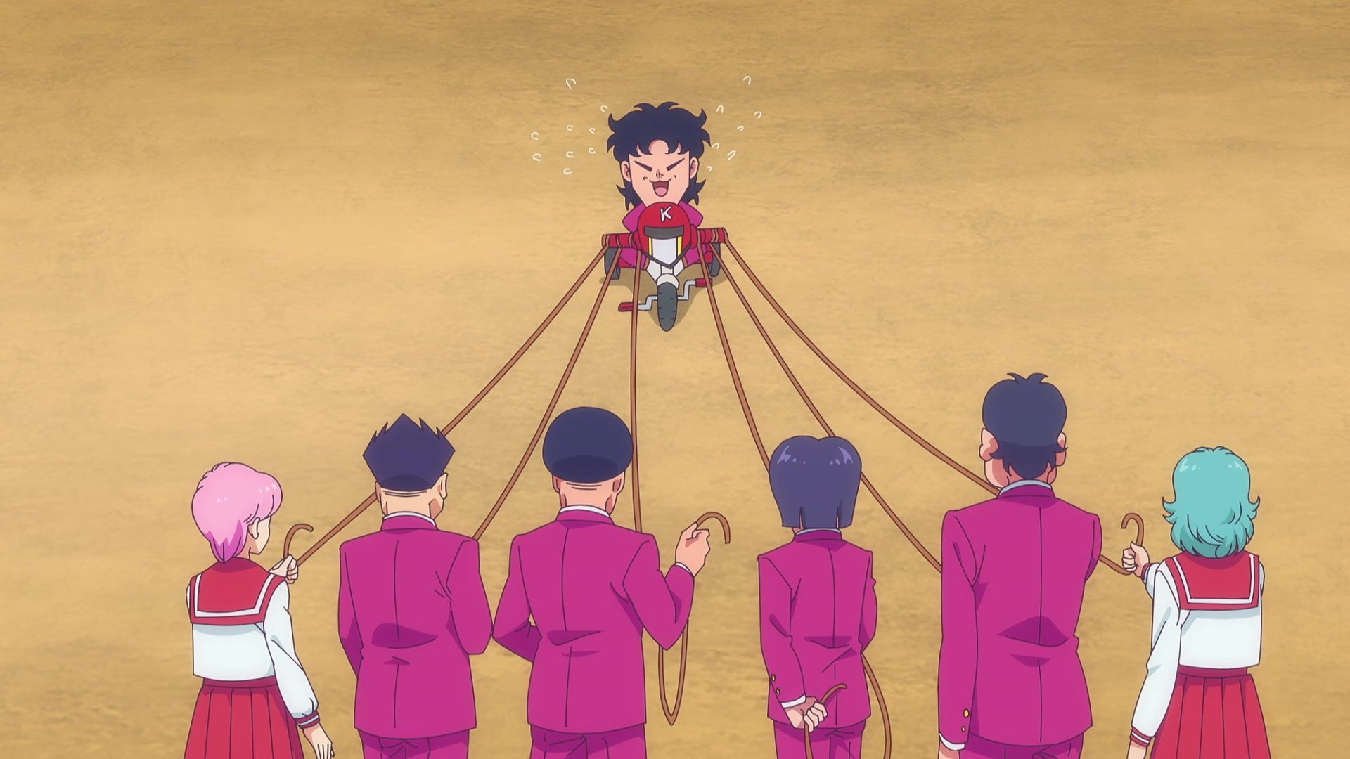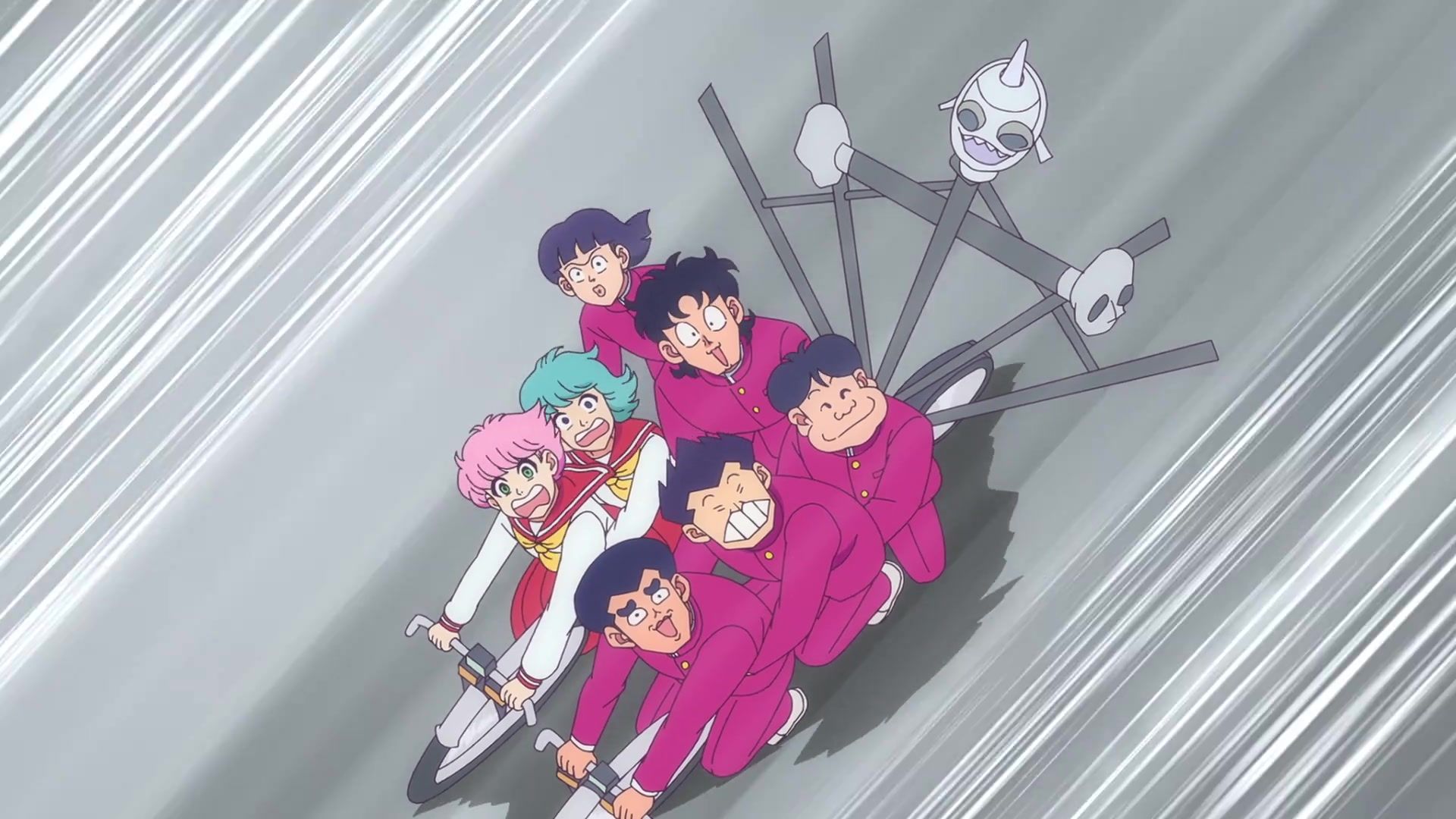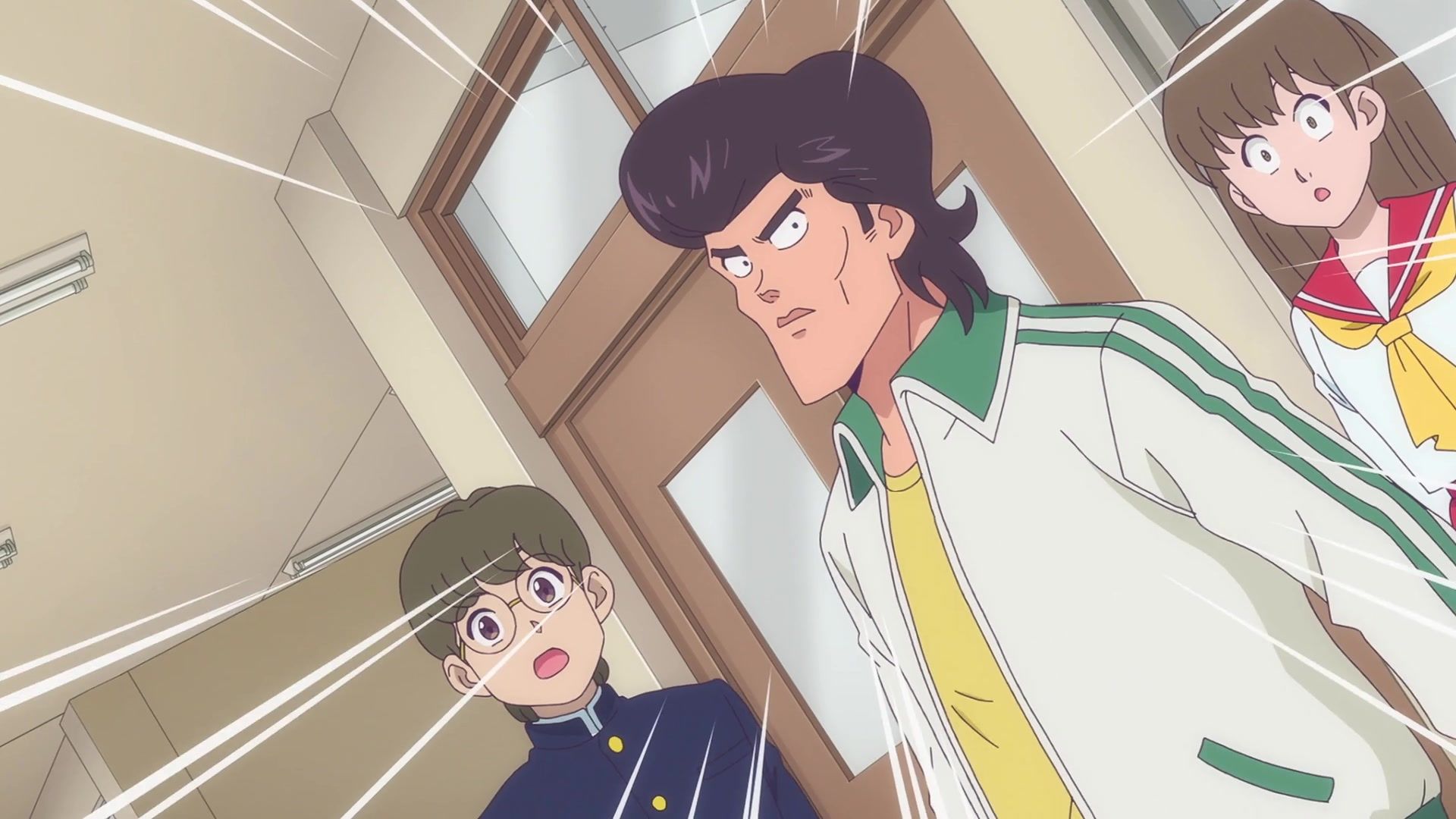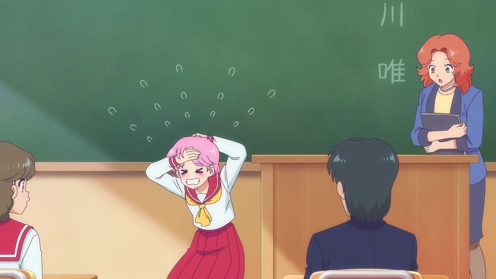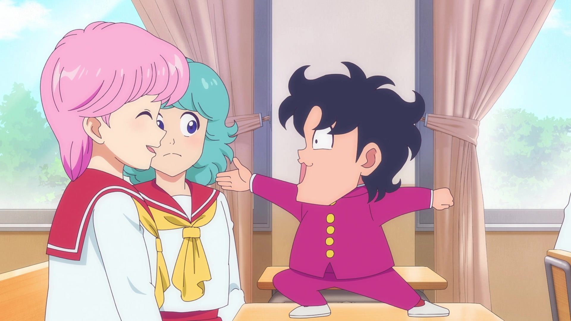It’s certainly trying to bring back the 80s, which seems to be noitaminA’s side project lately, much more than the recent Urusei Yatsura revival. Especially the character designs. Everyone has giant poofy hair, chins like a ton of bricks, and eyes that are either way too large or way too small with no in-between. There’s just one little rap at the start and then it’s entirely 80s, right down to the animators snorting a terrifying amount of cocaine. I think they were afraid of anybody accusing this show of not being chaotic enough. Or loud enough for that matter. There’s a throughline of characters yelling the entire episode. Not even always as reaction to anything, simply yelling to yell. The existence of silence displeases god… or something.