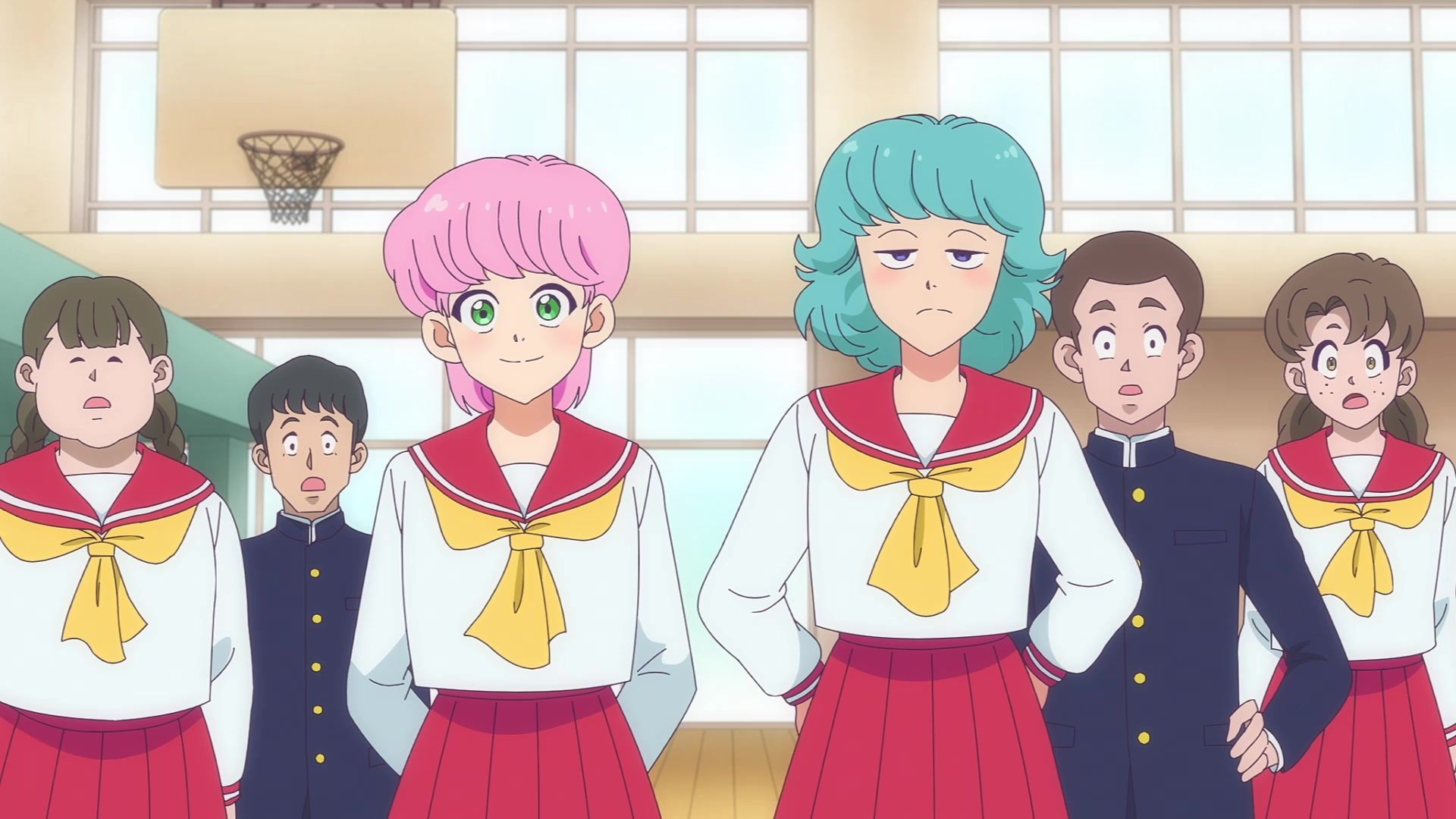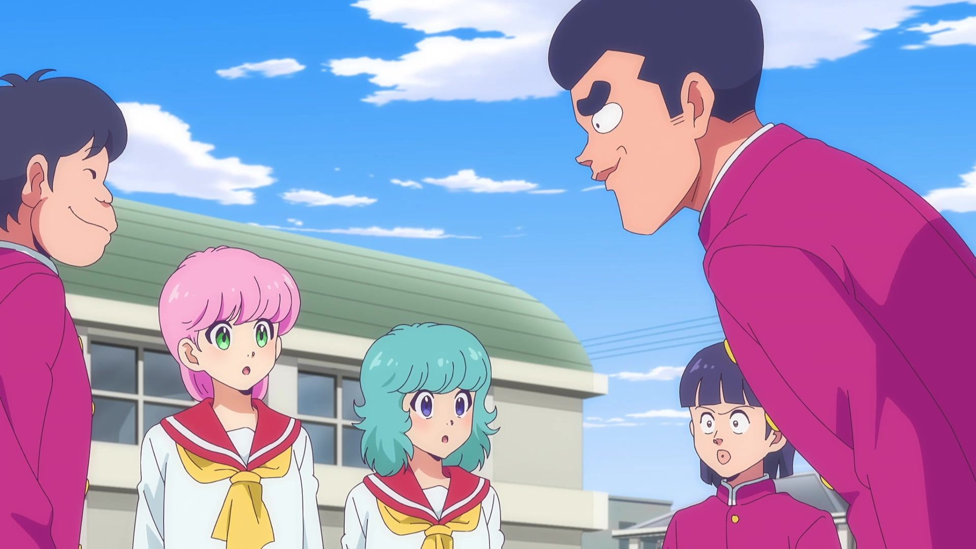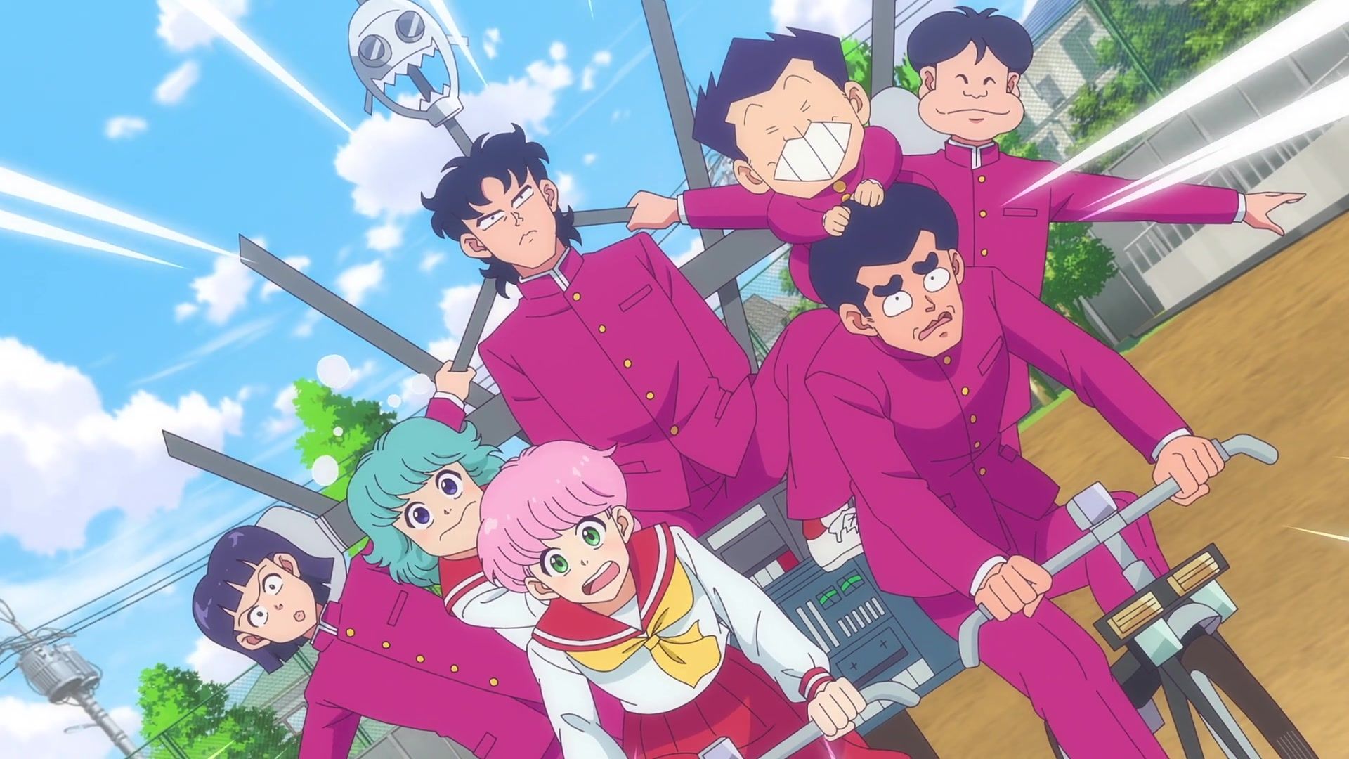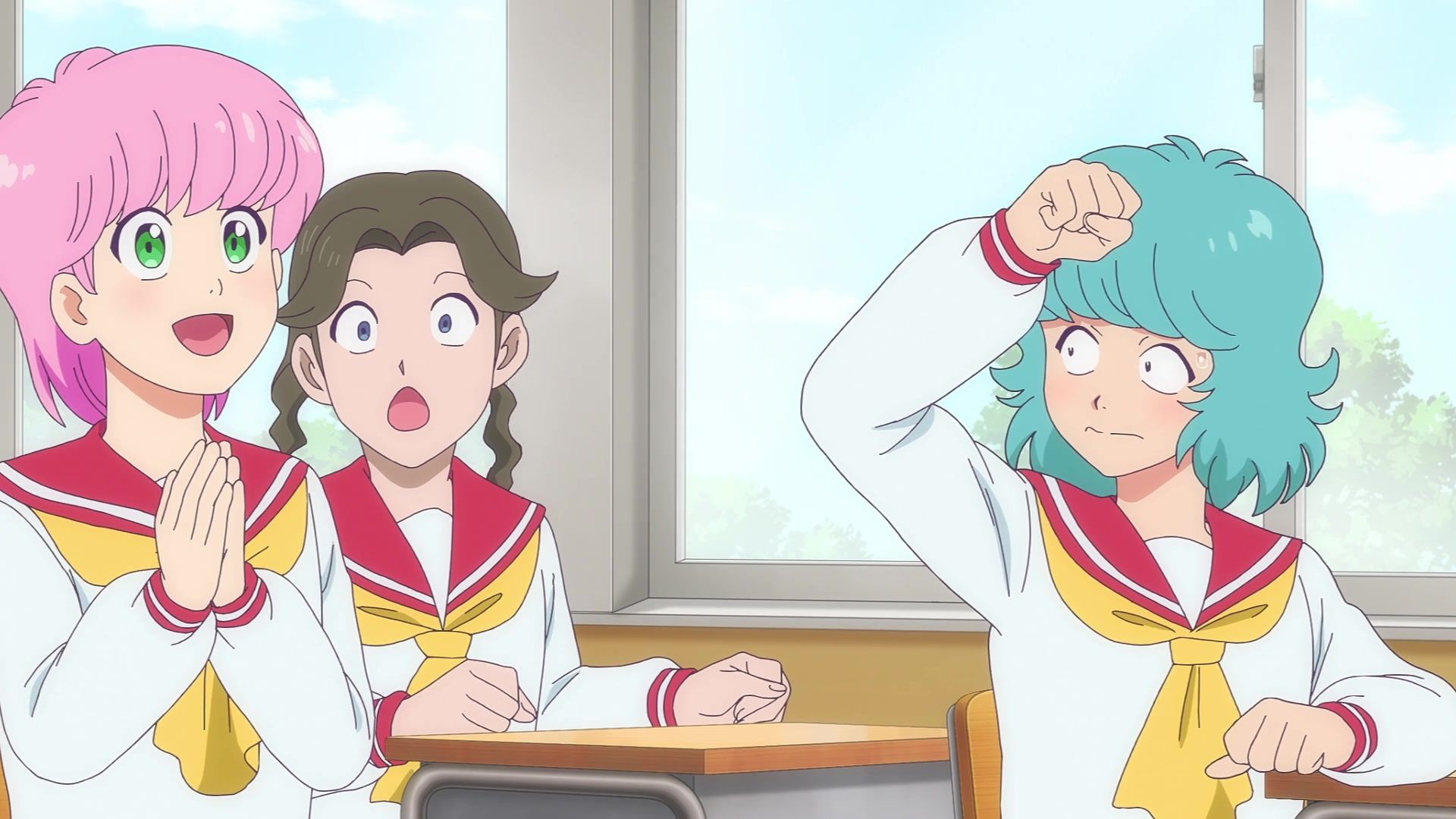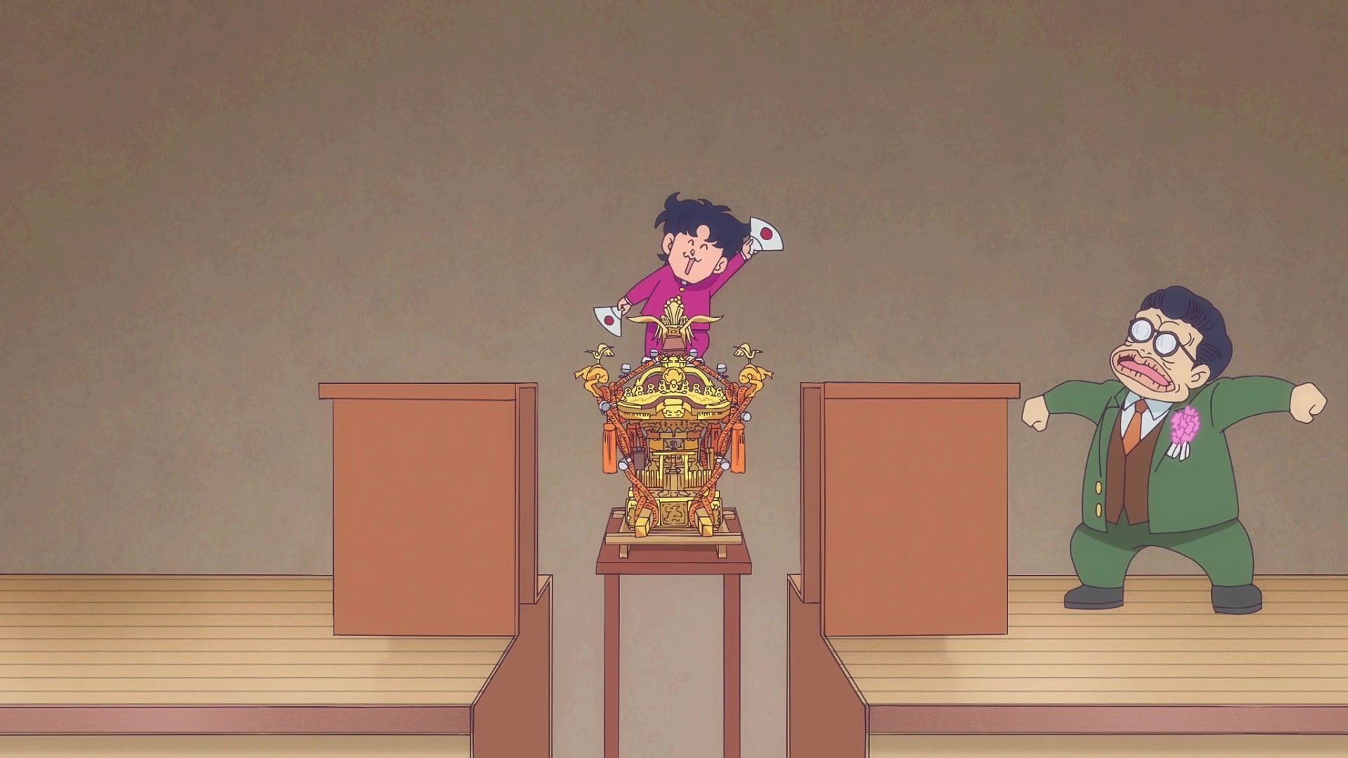 It’s certainly trying to bring back the 80s, which seems to be noitaminA’s side project lately, much more than the recent Urusei Yatsura revival. Especially the character designs. Everyone has giant poofy hair, chins like a ton of bricks, and eyes that are either way too large or way too small with no in-between. There’s just one little rap at the start and then it’s entirely 80s, right down to the animators snorting a terrifying amount of cocaine. I think they were afraid of anybody accusing this show of not being chaotic enough. Or loud enough for that matter. There’s a throughline of characters yelling the entire episode. Not even always as reaction to anything, simply yelling to yell. The existence of silence displeases god… or something.