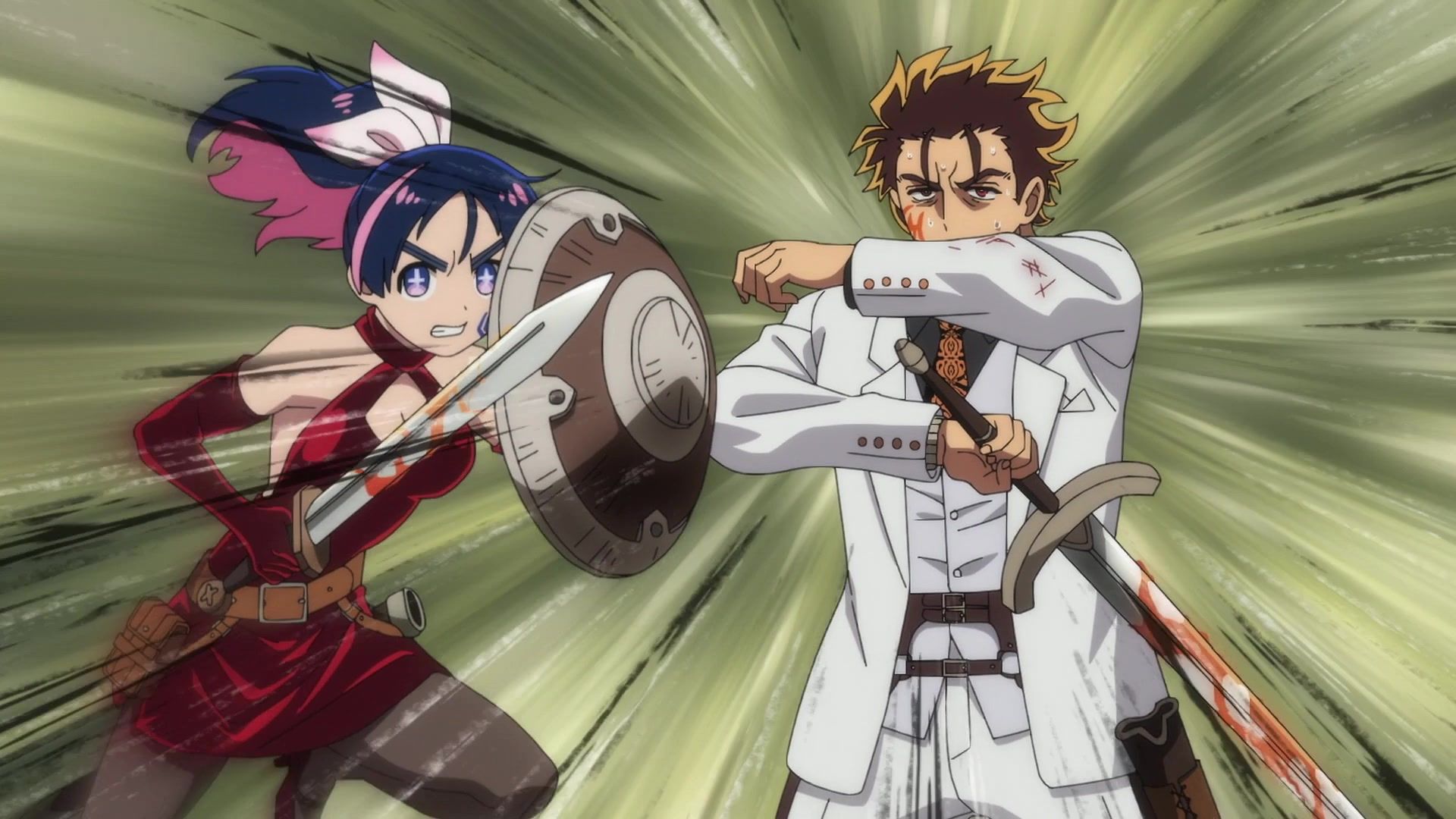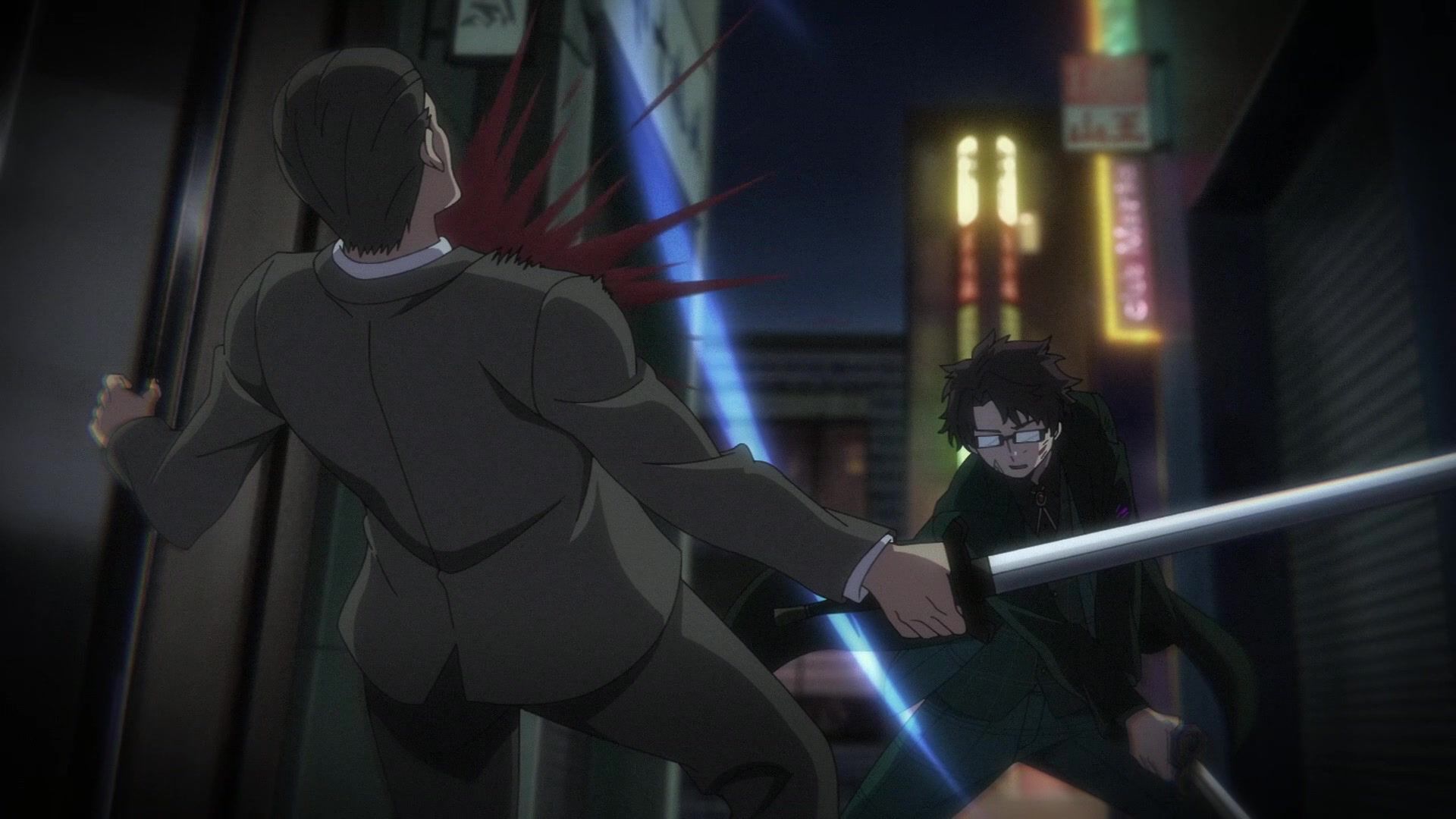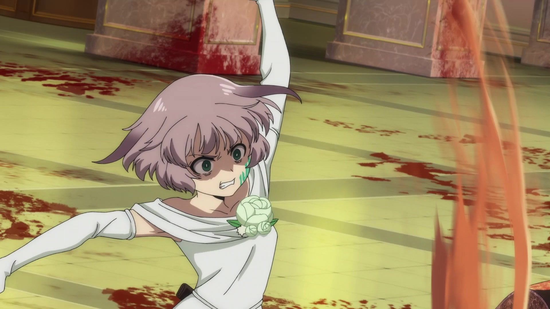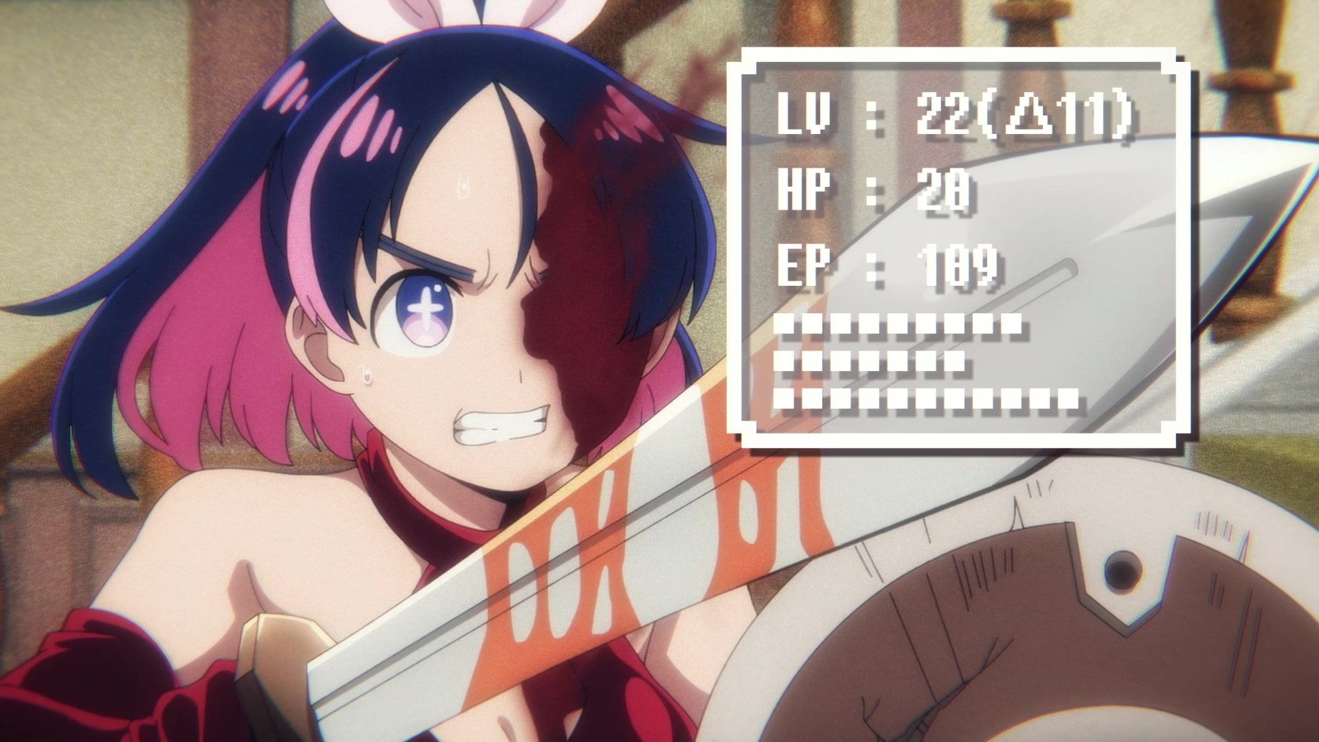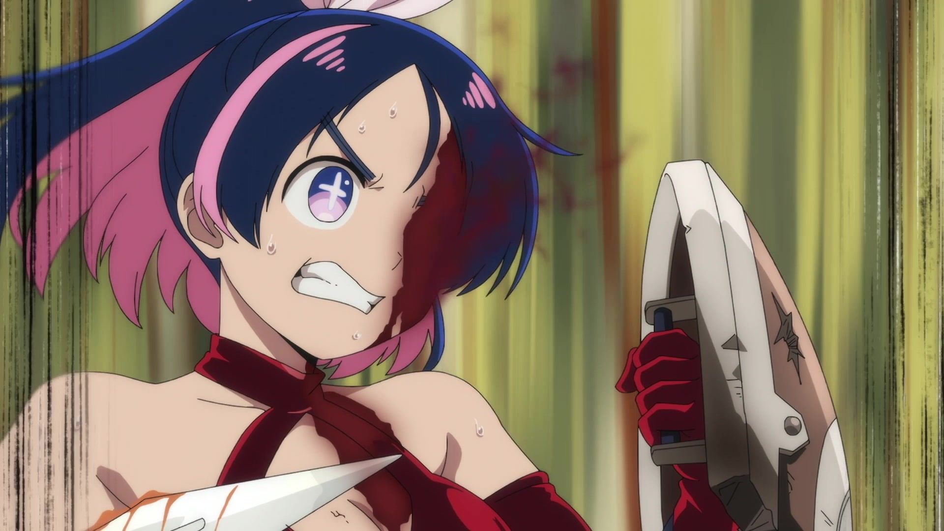 Ten minutes. Ten minutes in between Jogamine getting half her face gouged out and the fight with the rando that showed up to start. They spent ten minutes, standing there chatting, with the jank-ass CGI frogs trundling around in the background, getting sliced up by the other two girls. Can we pick up the pace ever so slightly? Do you understand how long ten minutes is? And this is with the ‘fights’ already getting time dilated by constant internal narrations to overexplain what’s going on while everything devolved into stills. Play as dramatic music as you want. It’s stills. Stills with a dude whose power is that he can see people’s levels.