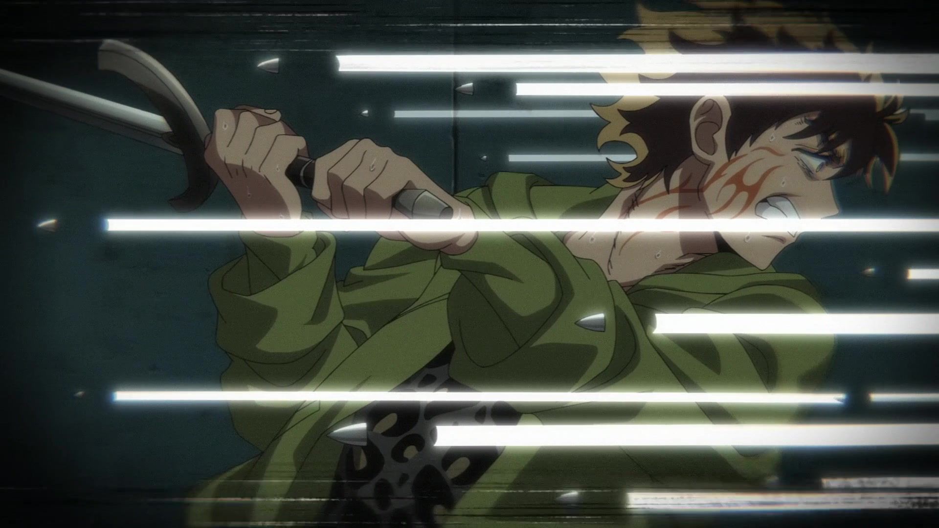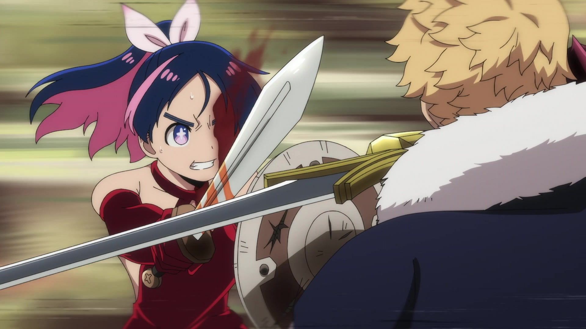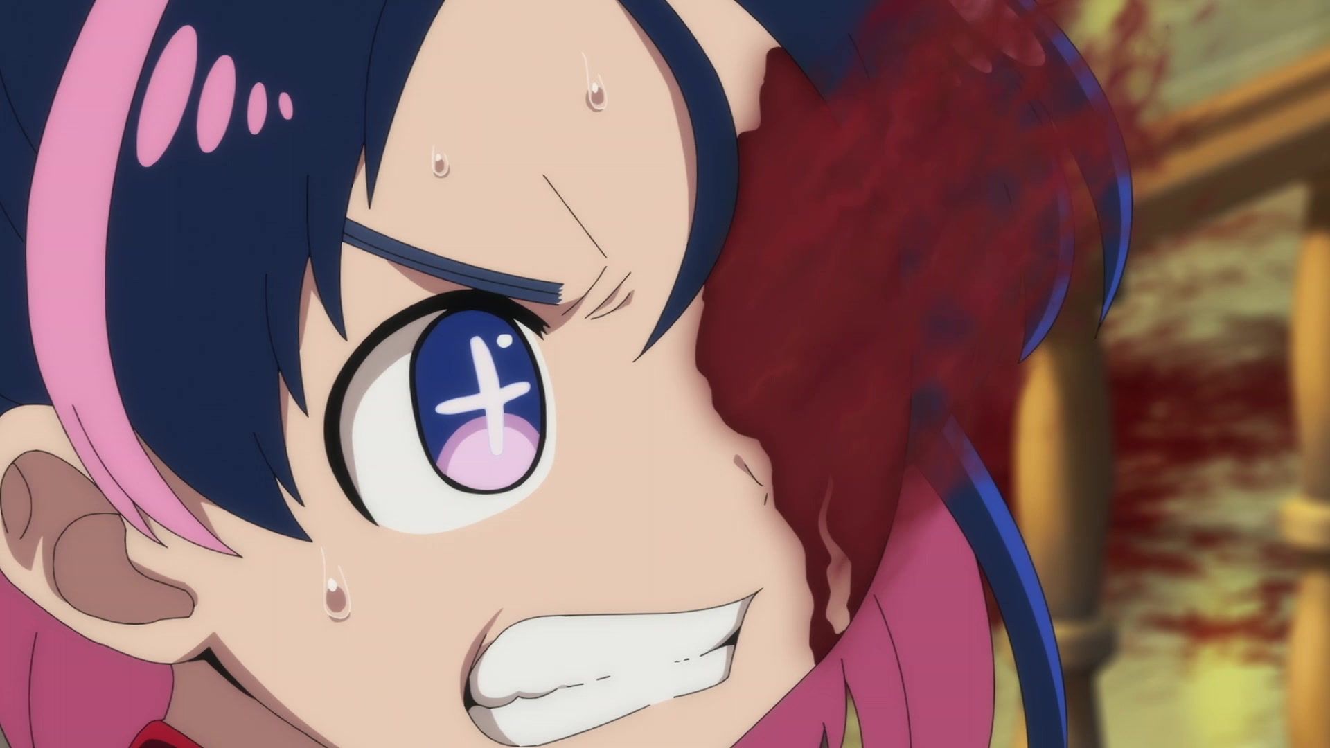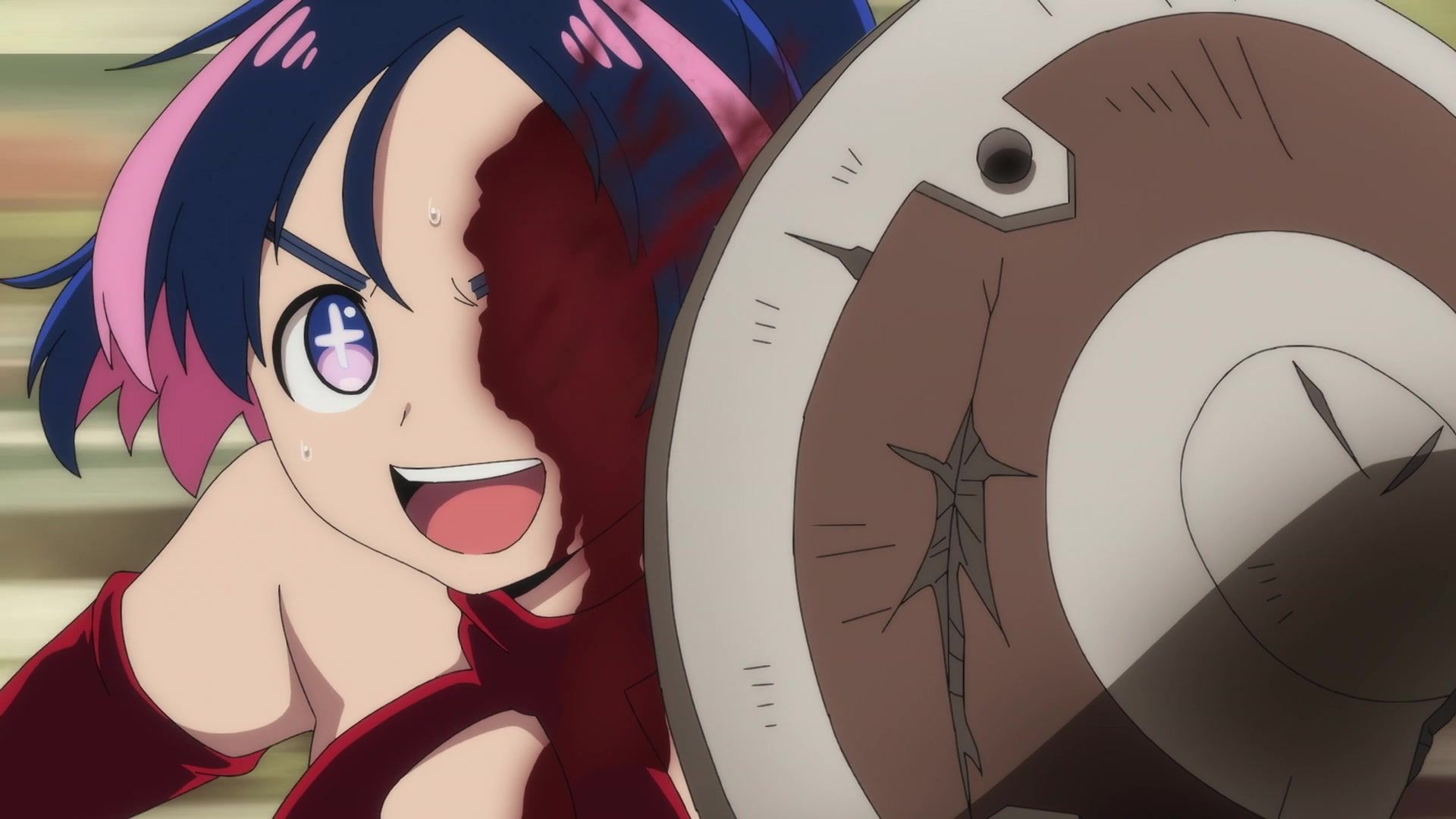 Ten minutes. Ten minutes in between Jogamine getting half her face gouged out and the fight with the rando that showed up to start. They spent ten minutes, standing there chatting, with the jank-ass CGI frogs trundling around in the background, getting sliced up by the other two girls. Can we pick up the pace ever so slightly? Do you understand how long ten minutes is? And this is with the ‘fights’ already getting time dilated by constant internal narrations to overexplain what’s going on while everything devolved into stills. Play as dramatic music as you want. It’s stills. Stills with a dude whose power is that he can see people’s levels.