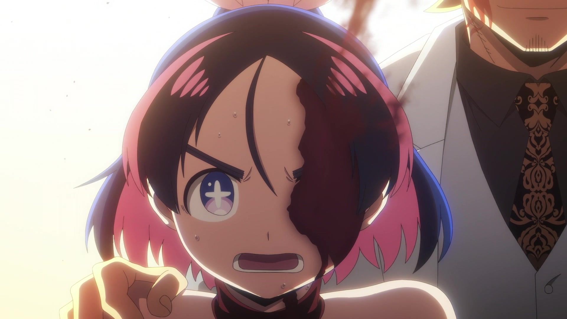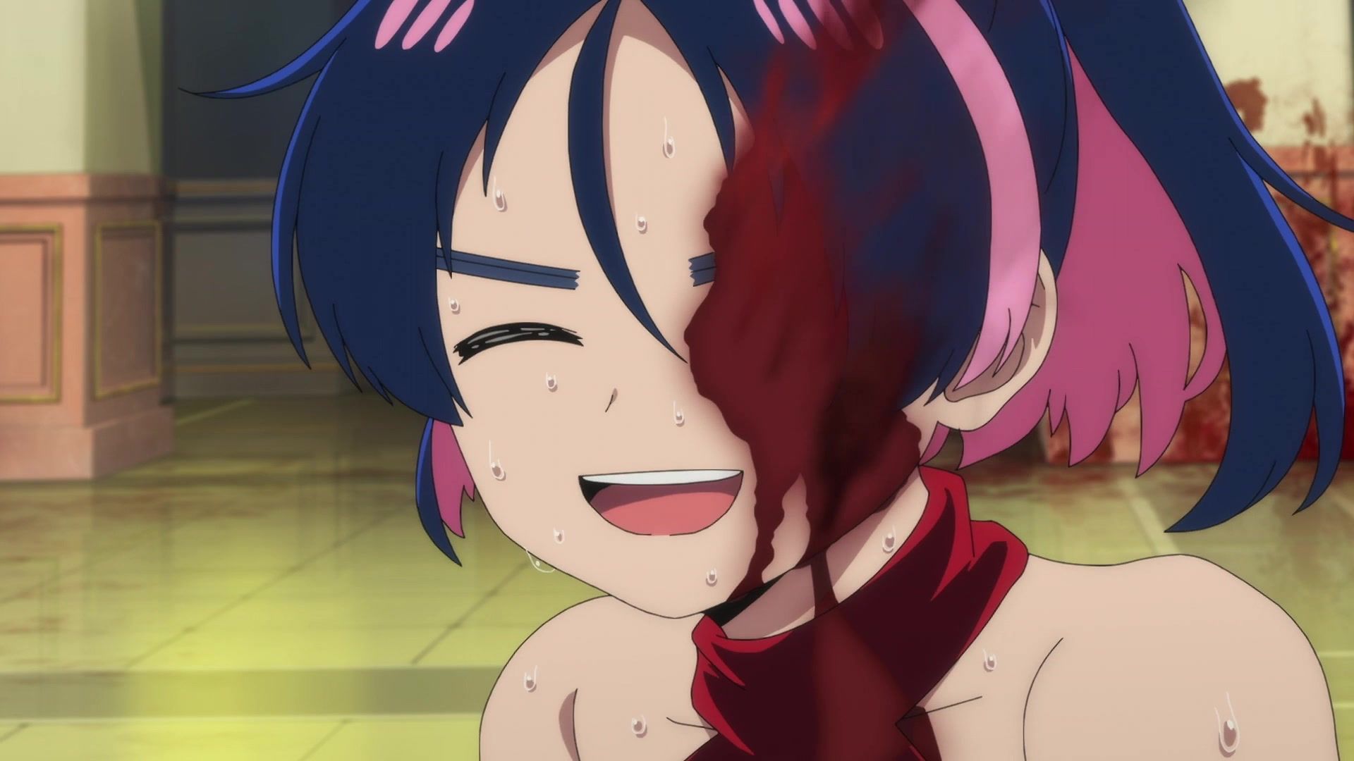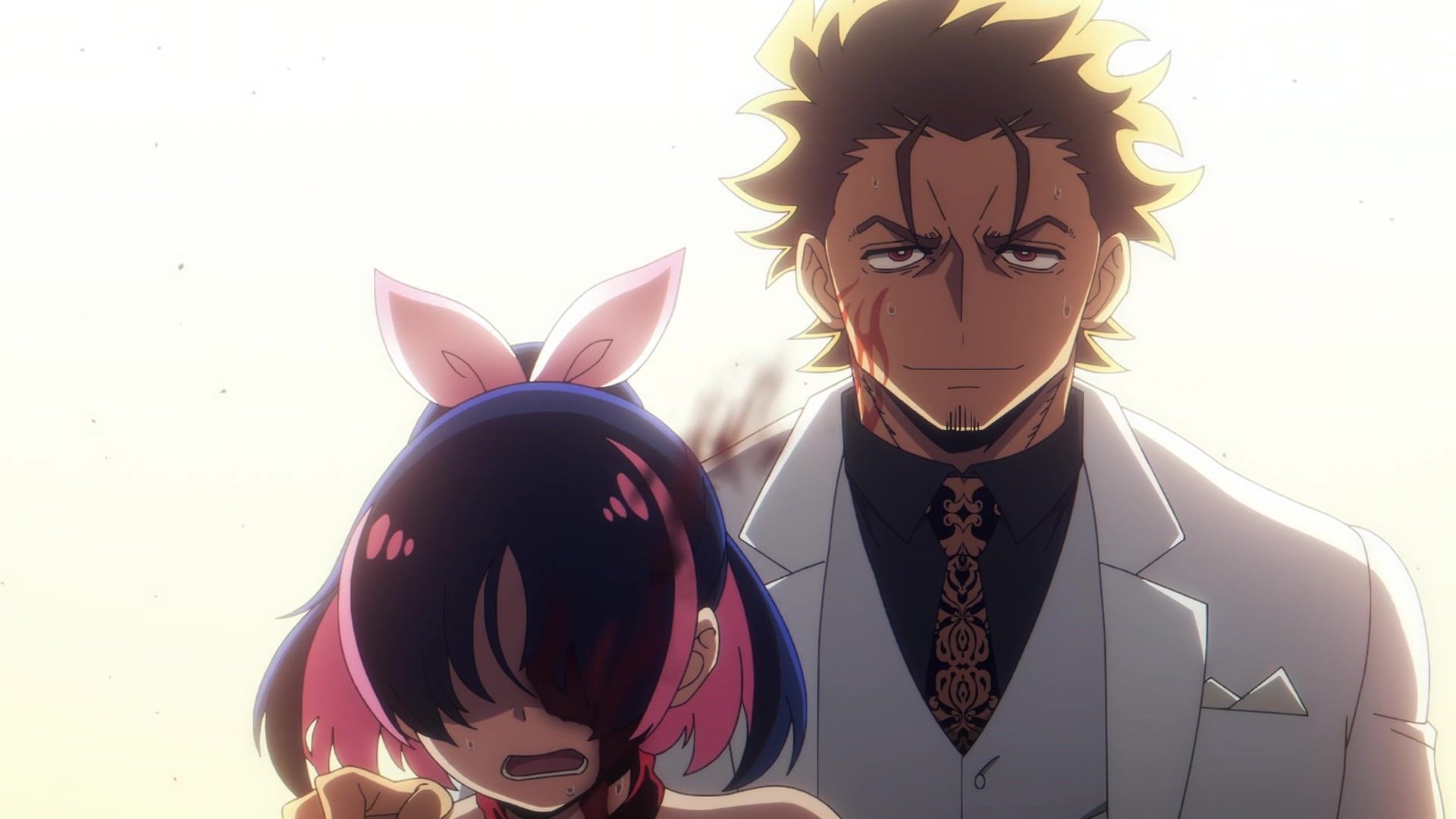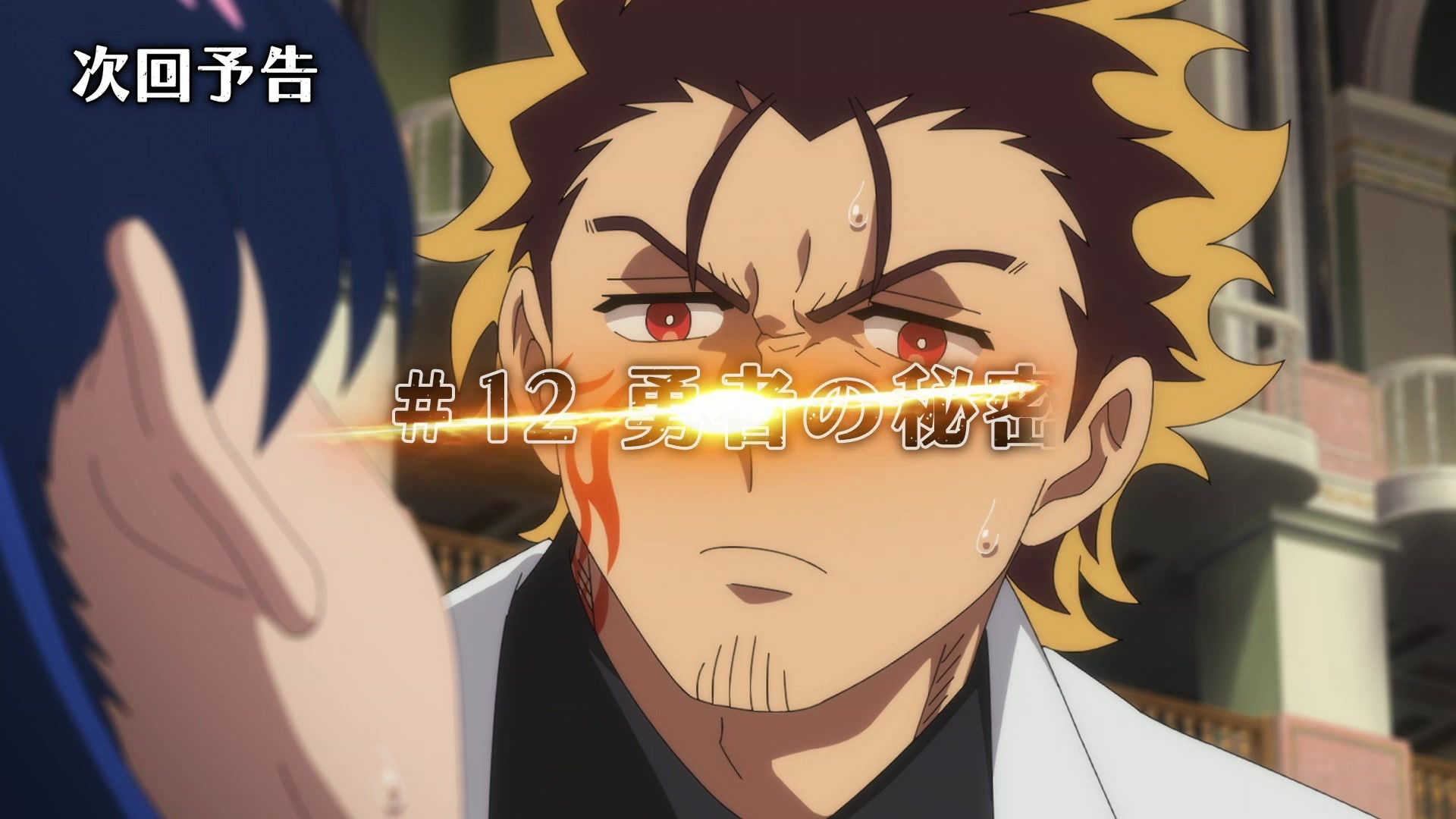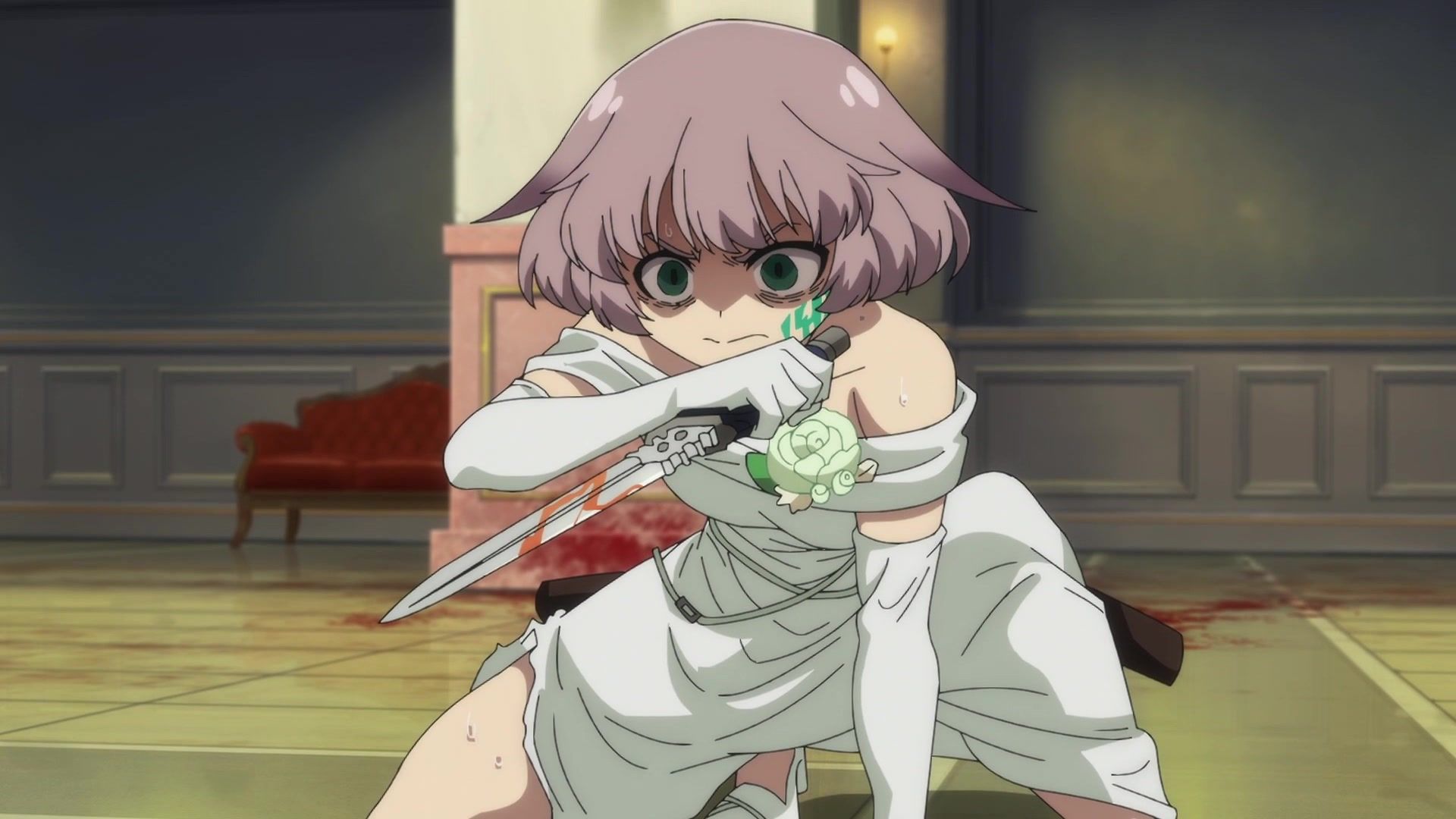 Ten minutes. Ten minutes in between Jogamine getting half her face gouged out and the fight with the rando that showed up to start. They spent ten minutes, standing there chatting, with the jank-ass CGI frogs trundling around in the background, getting sliced up by the other two girls. Can we pick up the pace ever so slightly? Do you understand how long ten minutes is? And this is with the ‘fights’ already getting time dilated by constant internal narrations to overexplain what’s going on while everything devolved into stills. Play as dramatic music as you want. It’s stills. Stills with a dude whose power is that he can see people’s levels.