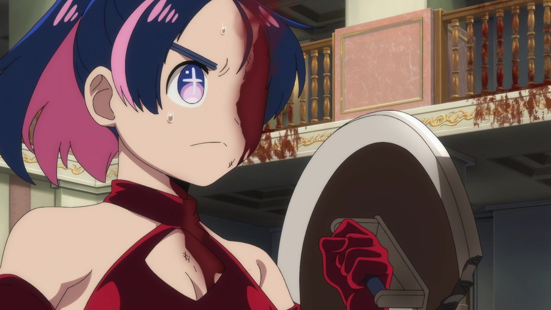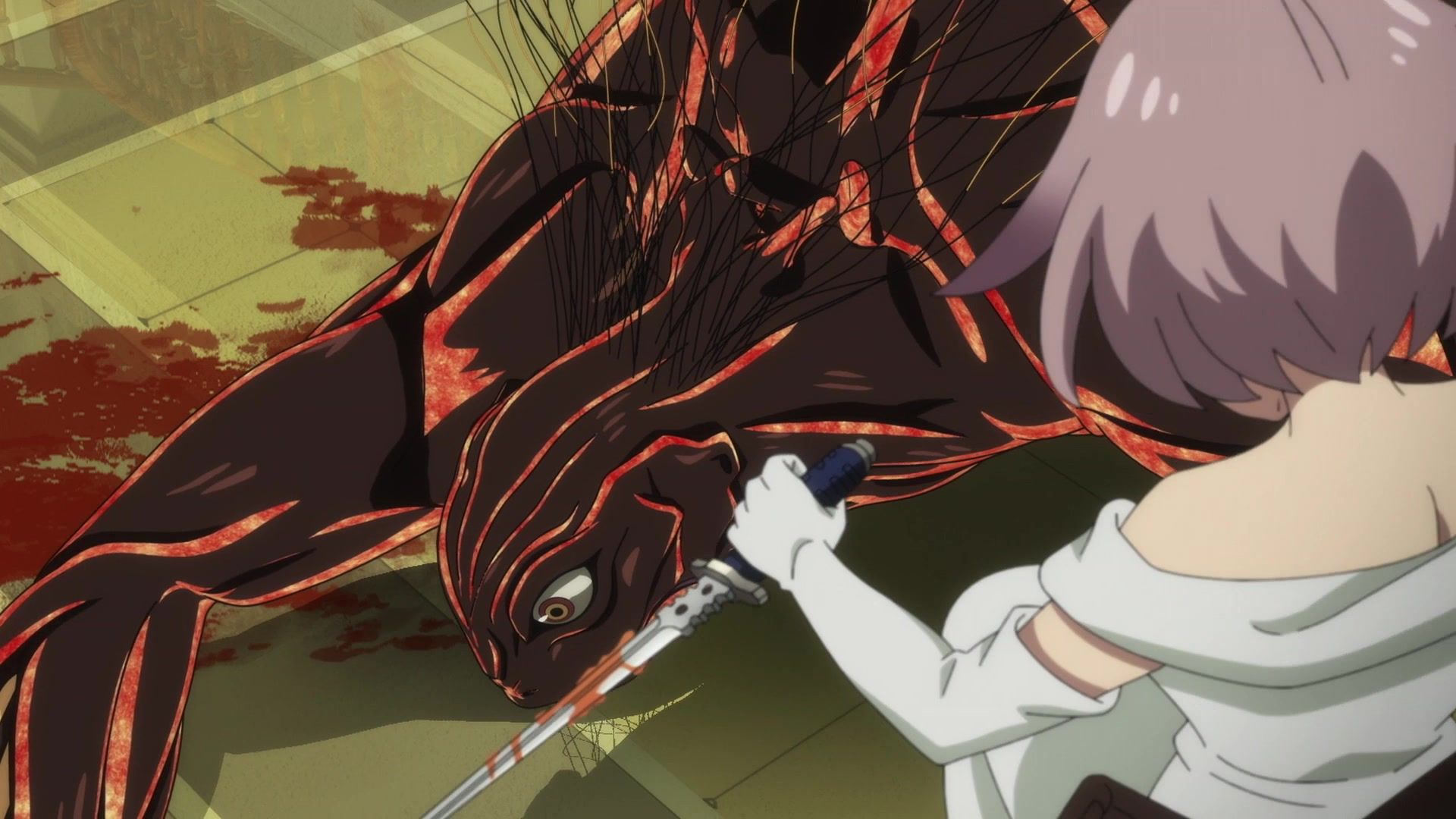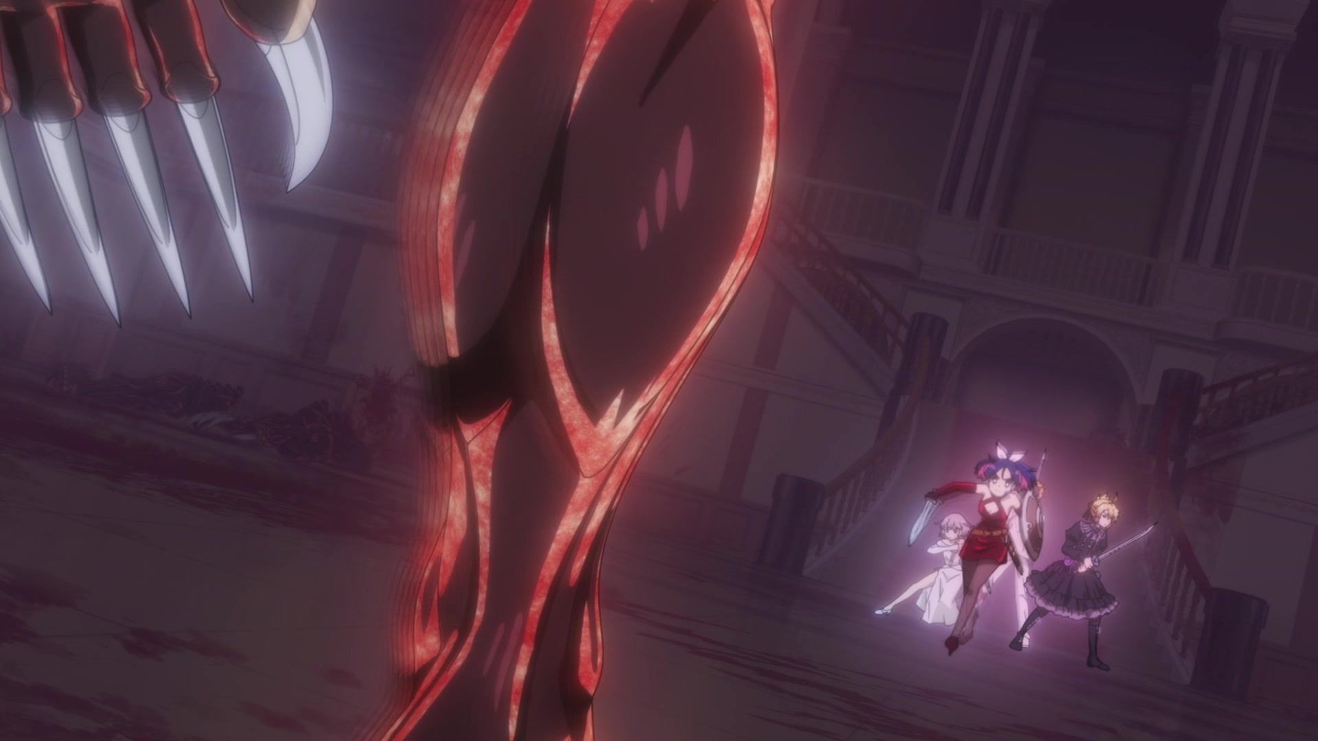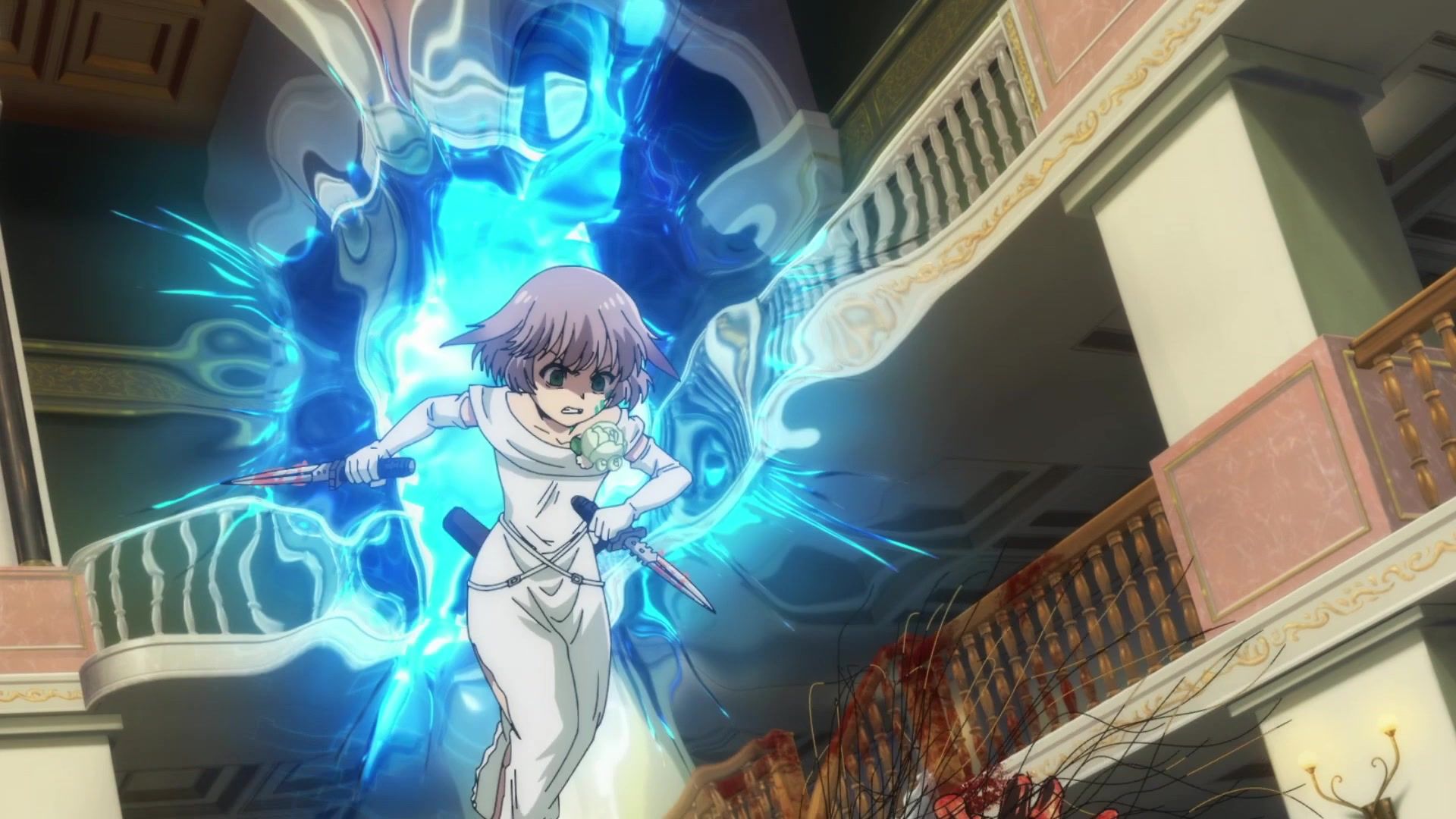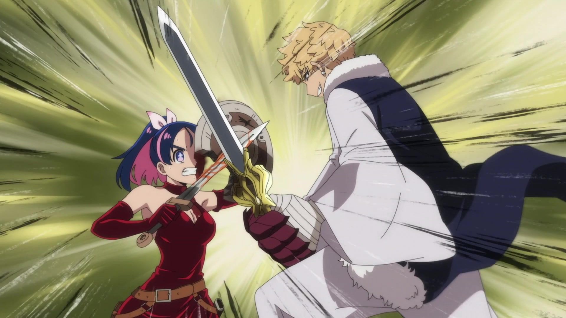 Ten minutes. Ten minutes in between Jogamine getting half her face gouged out and the fight with the rando that showed up to start. They spent ten minutes, standing there chatting, with the jank-ass CGI frogs trundling around in the background, getting sliced up by the other two girls. Can we pick up the pace ever so slightly? Do you understand how long ten minutes is? And this is with the ‘fights’ already getting time dilated by constant internal narrations to overexplain what’s going on while everything devolved into stills. Play as dramatic music as you want. It’s stills. Stills with a dude whose power is that he can see people’s levels.
