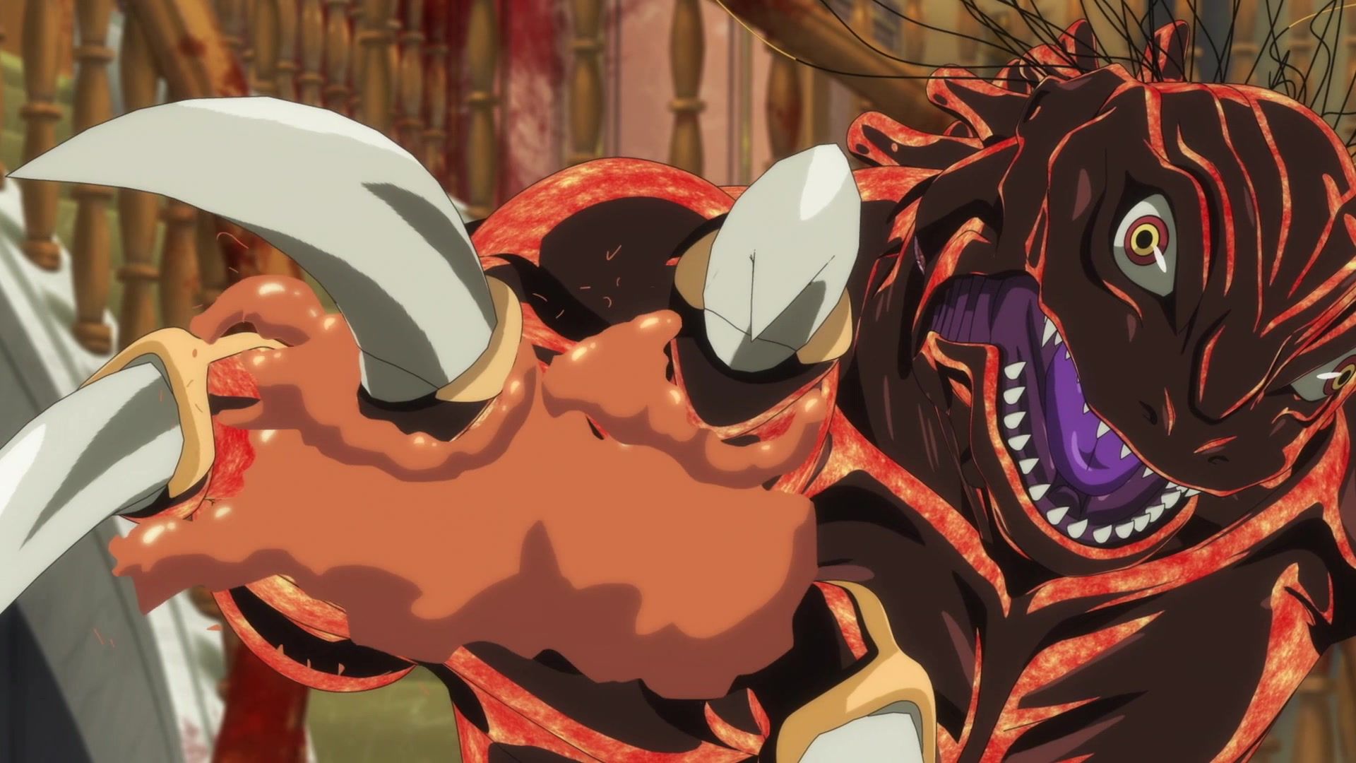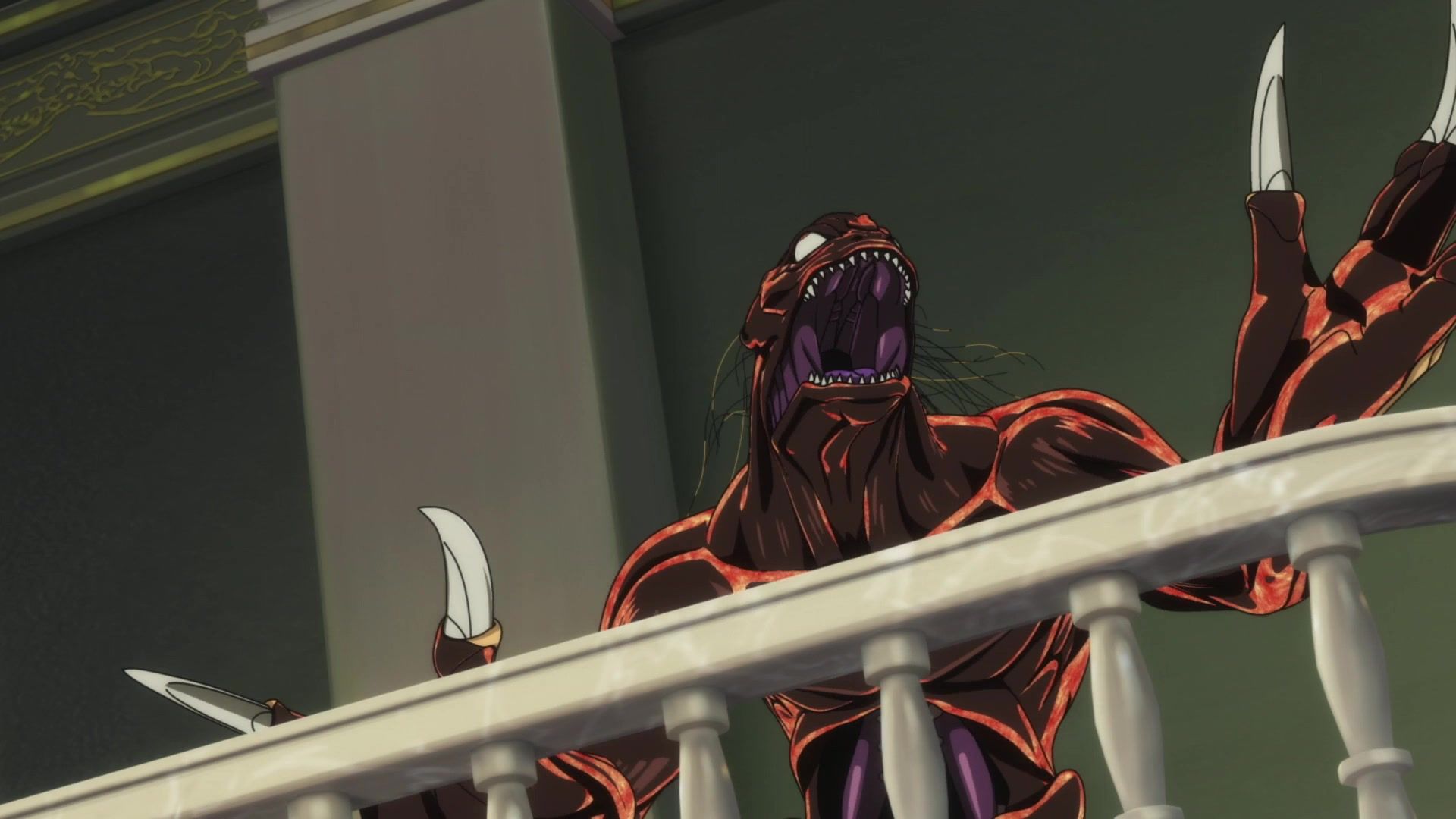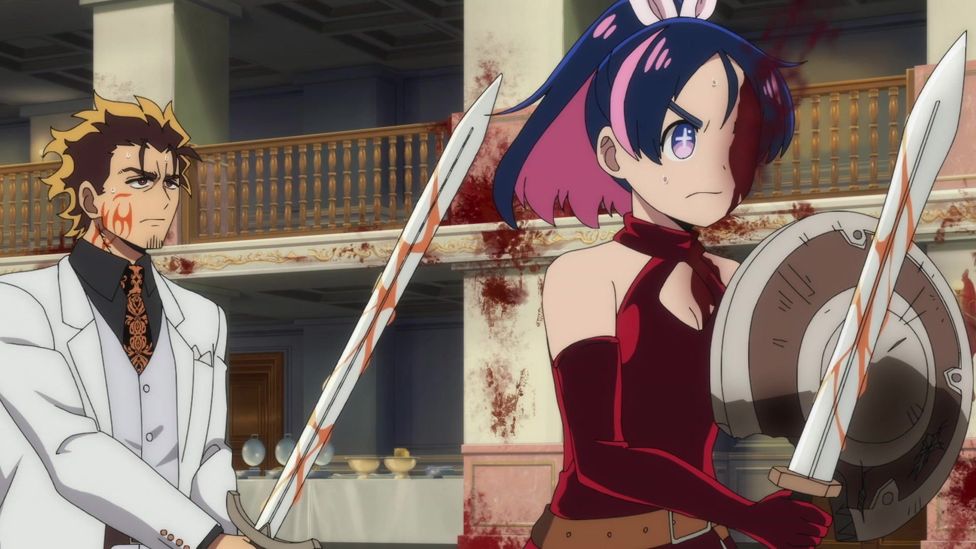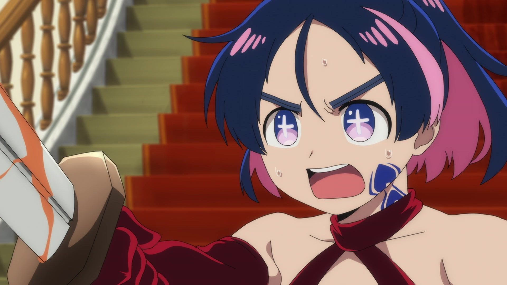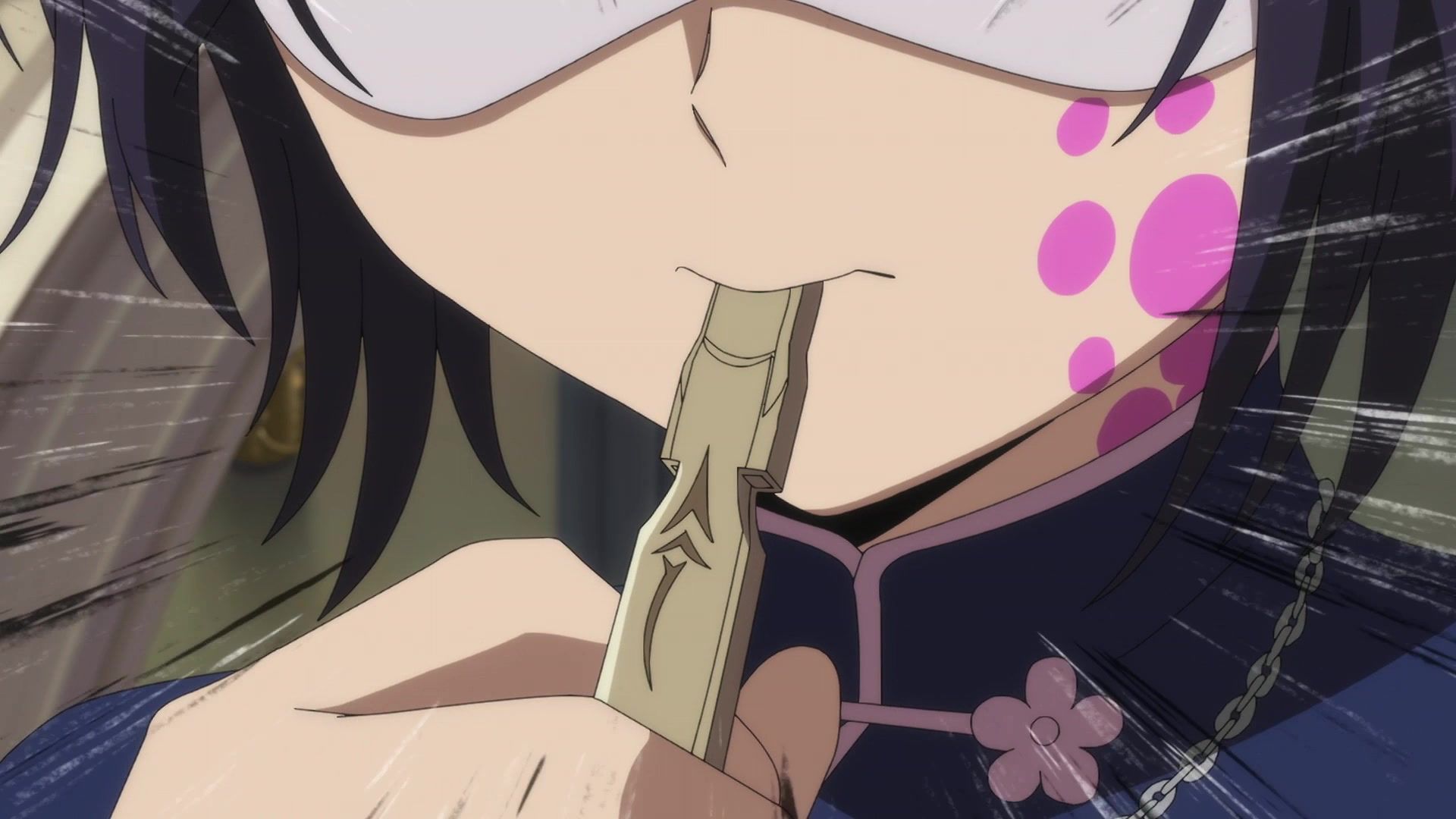 Ten minutes. Ten minutes in between Jogamine getting half her face gouged out and the fight with the rando that showed up to start. They spent ten minutes, standing there chatting, with the jank-ass CGI frogs trundling around in the background, getting sliced up by the other two girls. Can we pick up the pace ever so slightly? Do you understand how long ten minutes is? And this is with the ‘fights’ already getting time dilated by constant internal narrations to overexplain what’s going on while everything devolved into stills. Play as dramatic music as you want. It’s stills. Stills with a dude whose power is that he can see people’s levels.