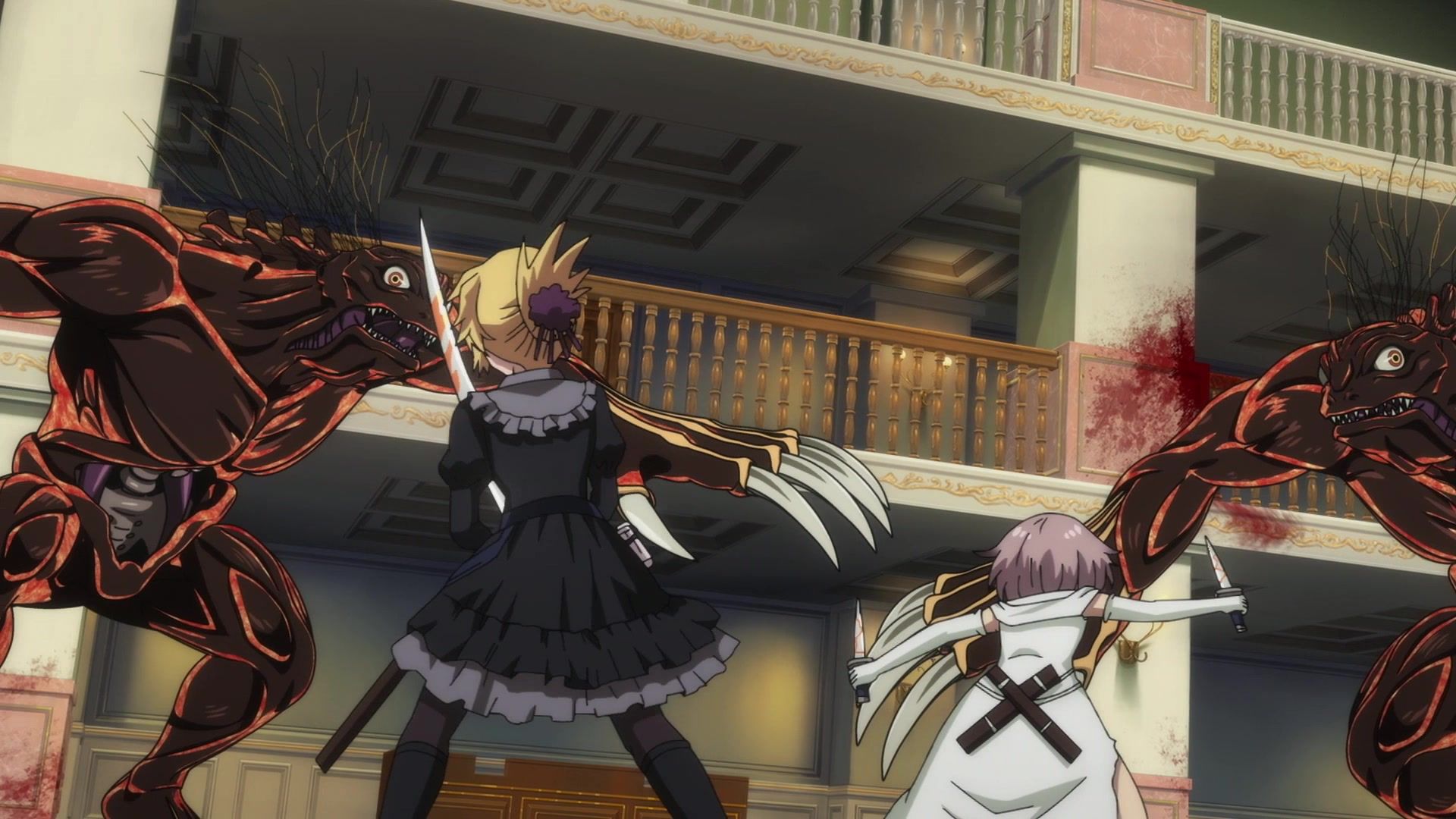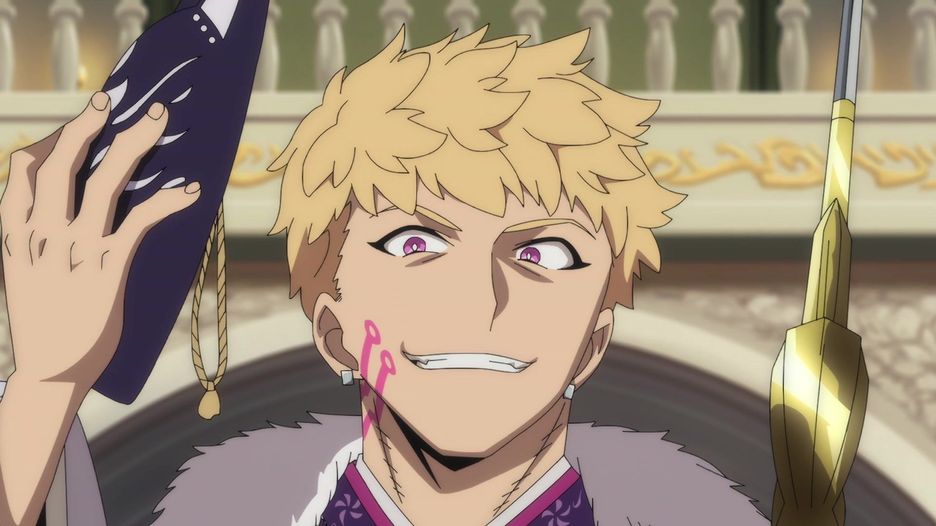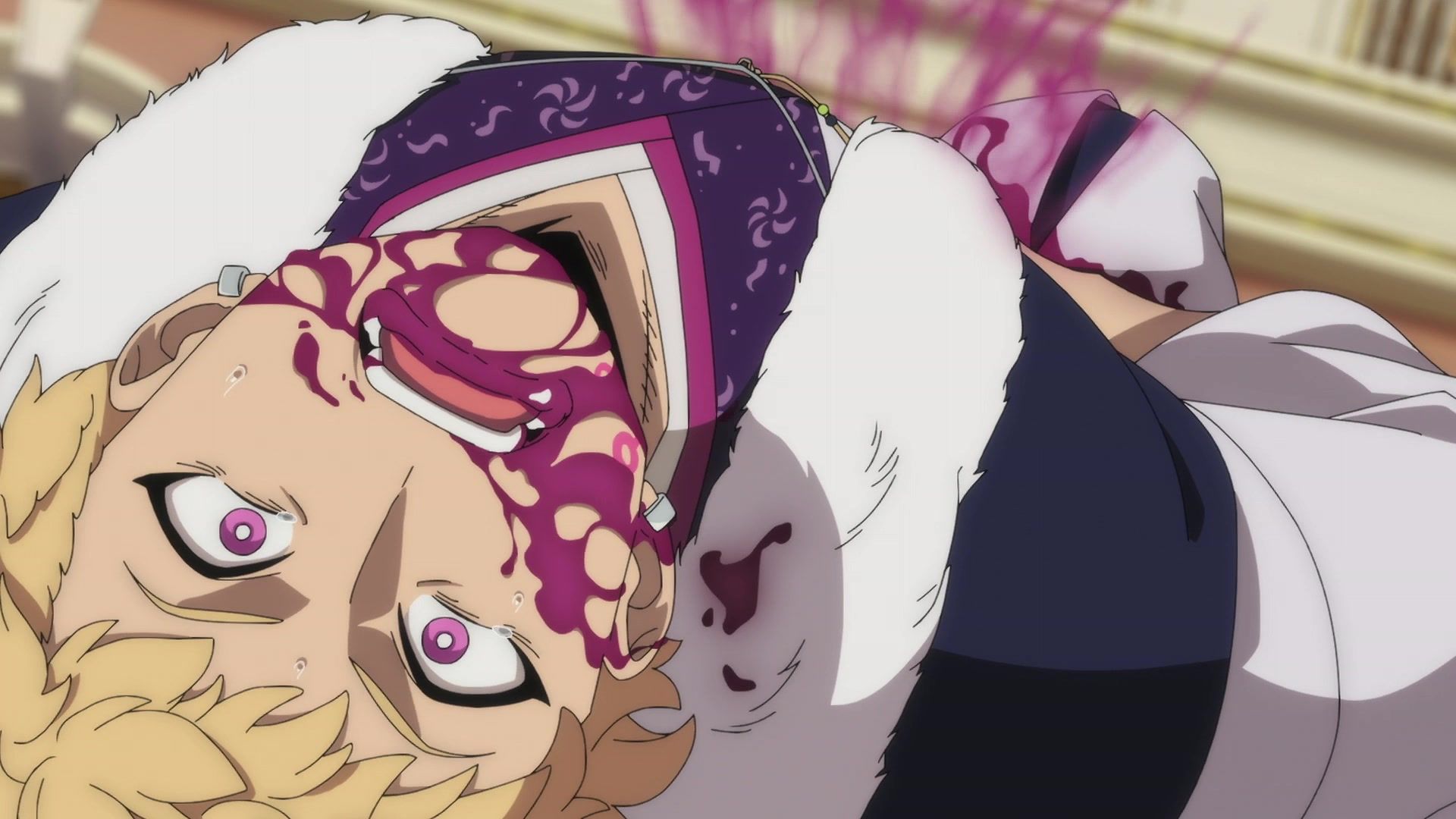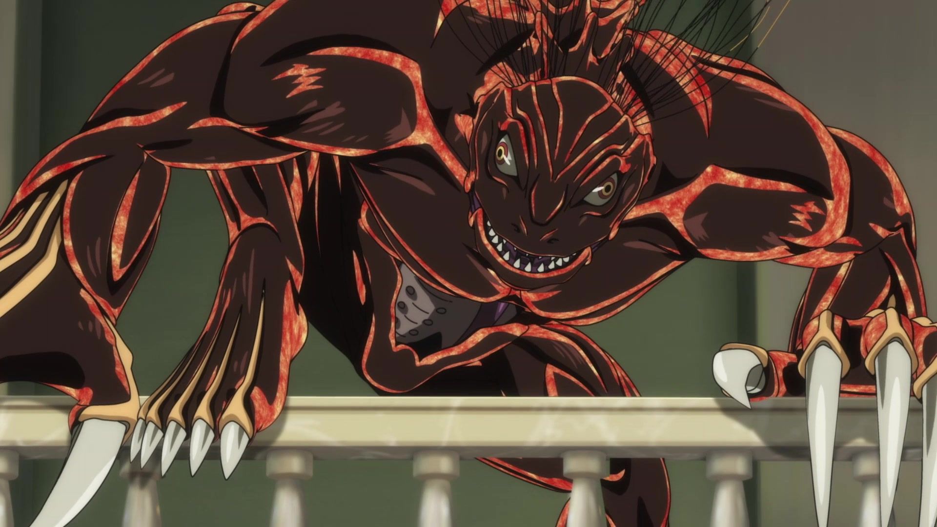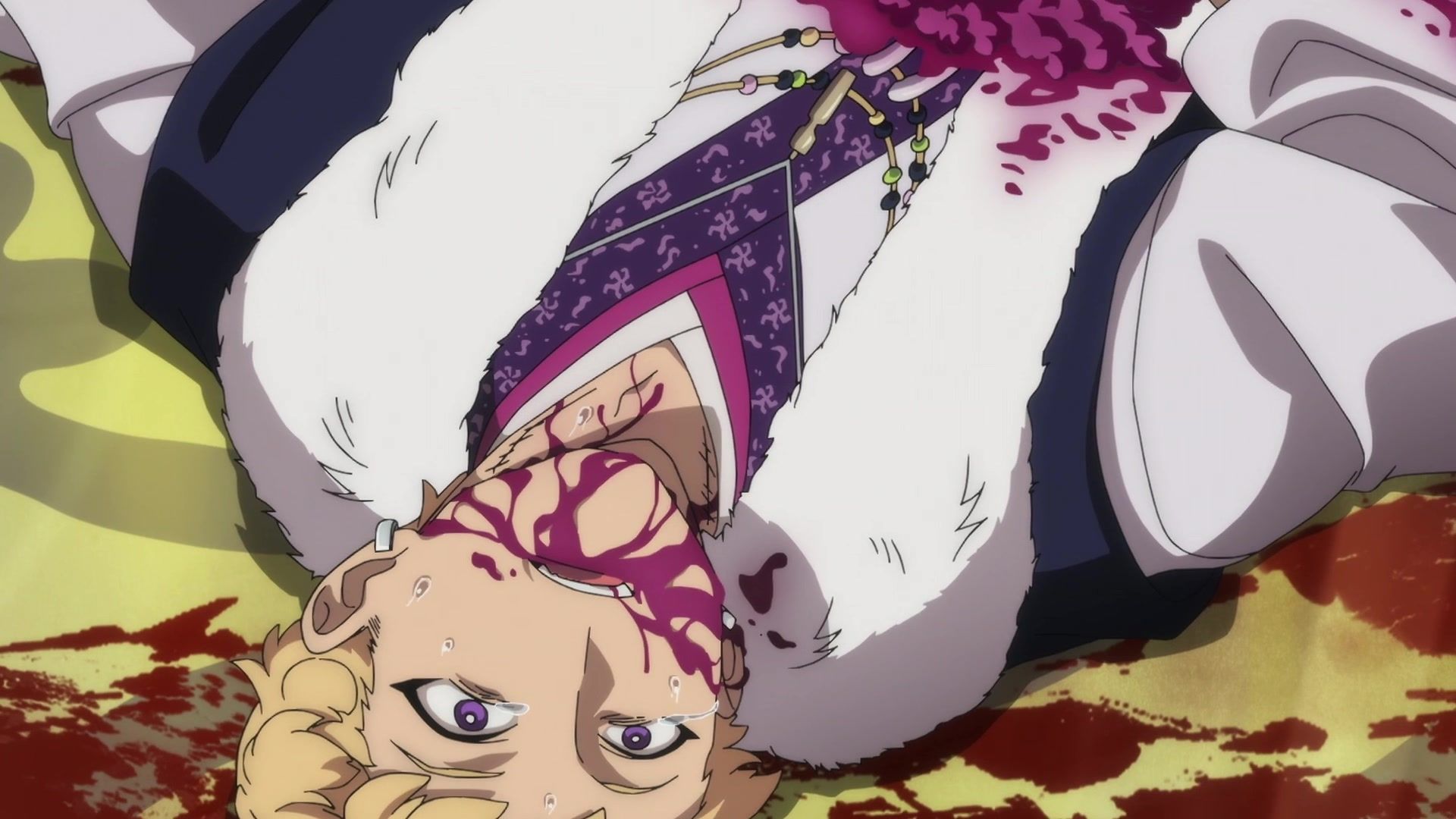Ten minutes. Ten minutes in between Jogamine getting half her face gouged out and the fight with the rando that showed up to start. They spent ten minutes, standing there chatting, with the jank-ass CGI frogs trundling around in the background, getting sliced up by the other two girls. Can we pick up the pace ever so slightly? Do you understand how long ten minutes is? And this is with the ‘fights’ already getting time dilated by constant internal narrations to overexplain what’s going on while everything devolved into stills. Play as dramatic music as you want. It’s stills. Stills with a dude whose power is that he can see people’s levels.