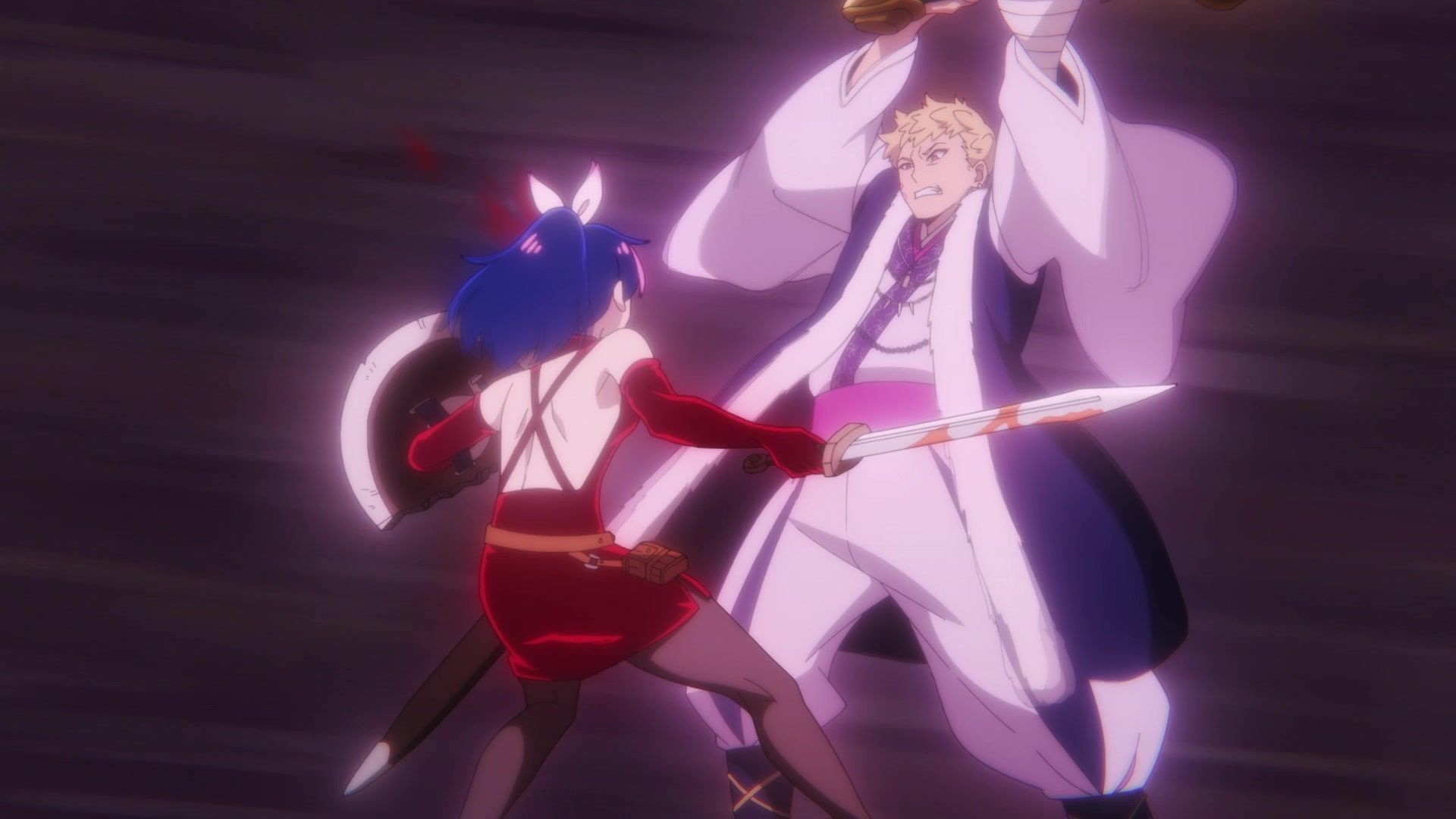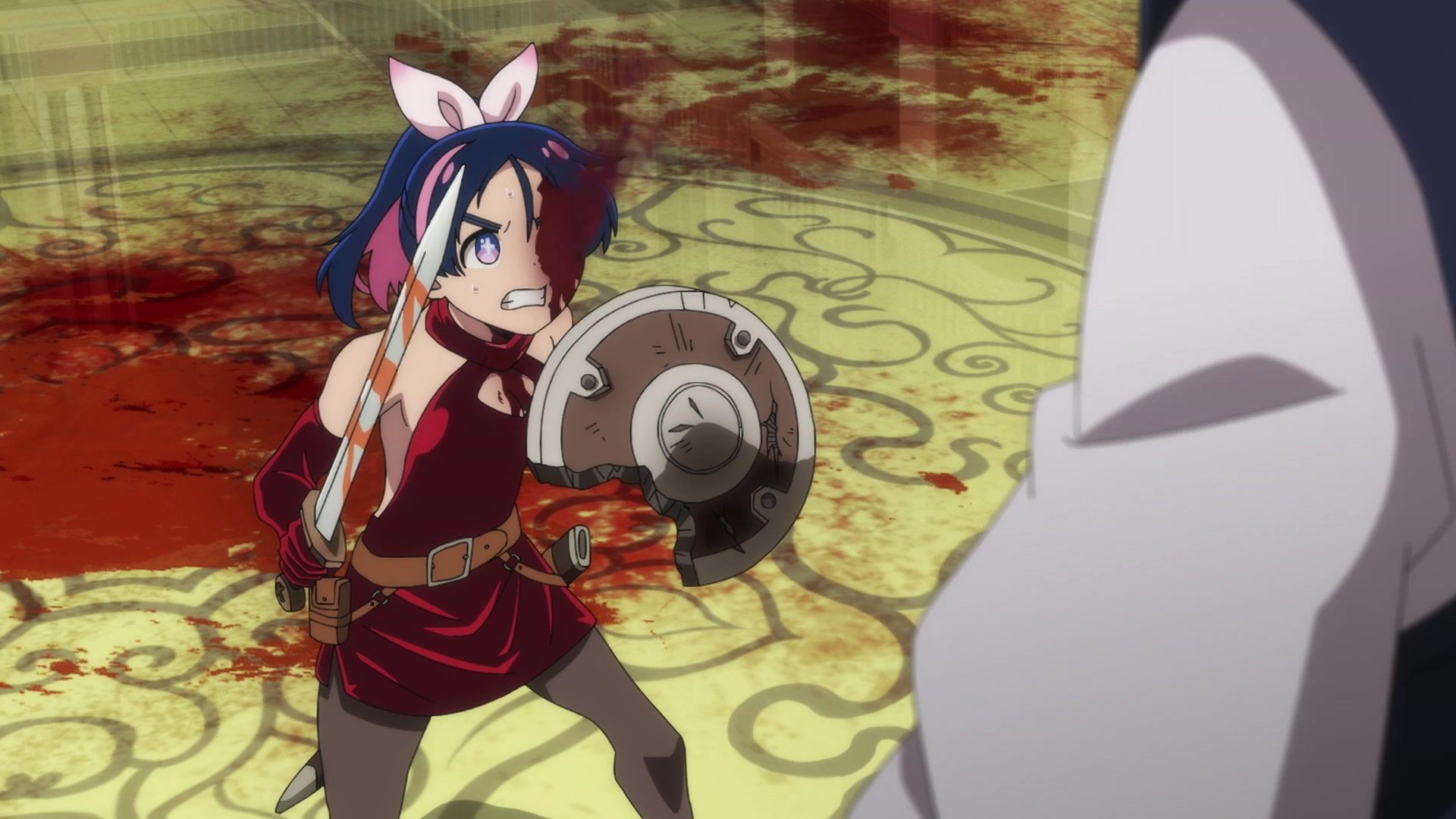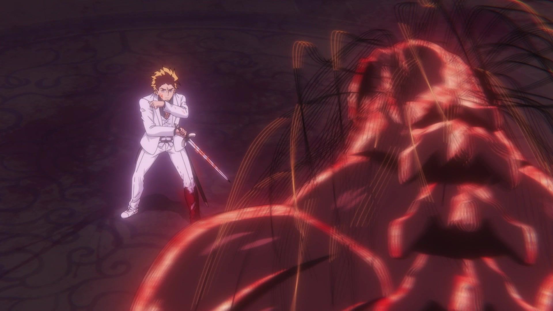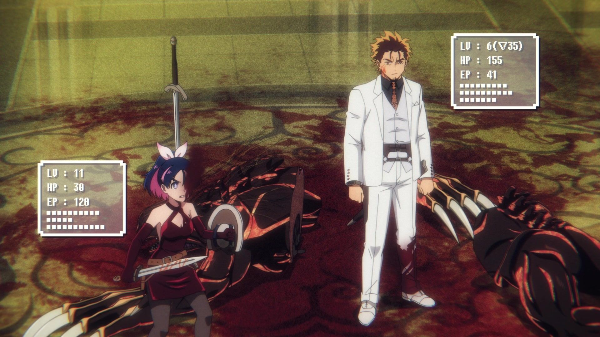 All this leading up to… just sucker punching the guy with a knife? Dude sure went down unceremoniously for all the rambling. The ten goddamned minutes of rambling. And status screens. Goddamned status screens. He got bisected by… that one still? Come on. At least make it look slightly believable. You’re only drawing about two frames anyway. Everything here was so unfathomably dumb.