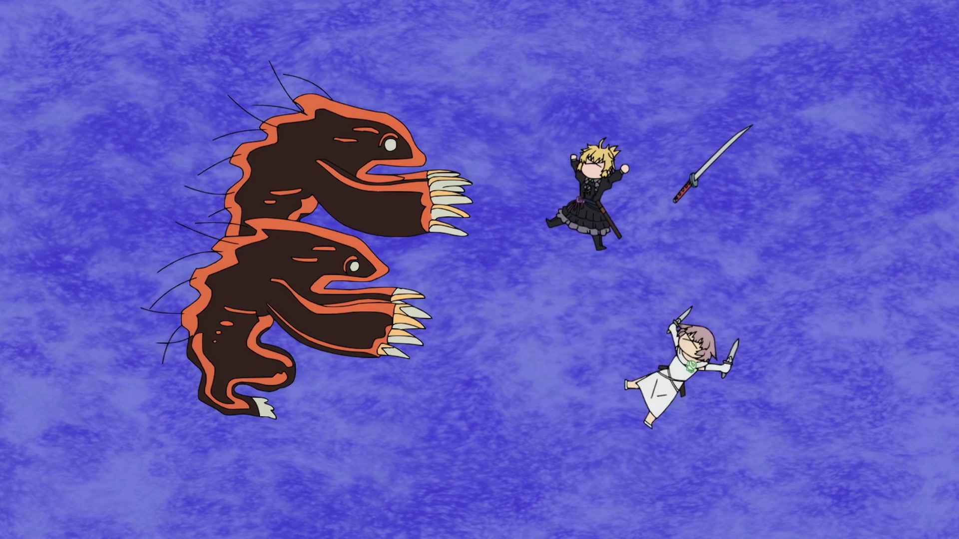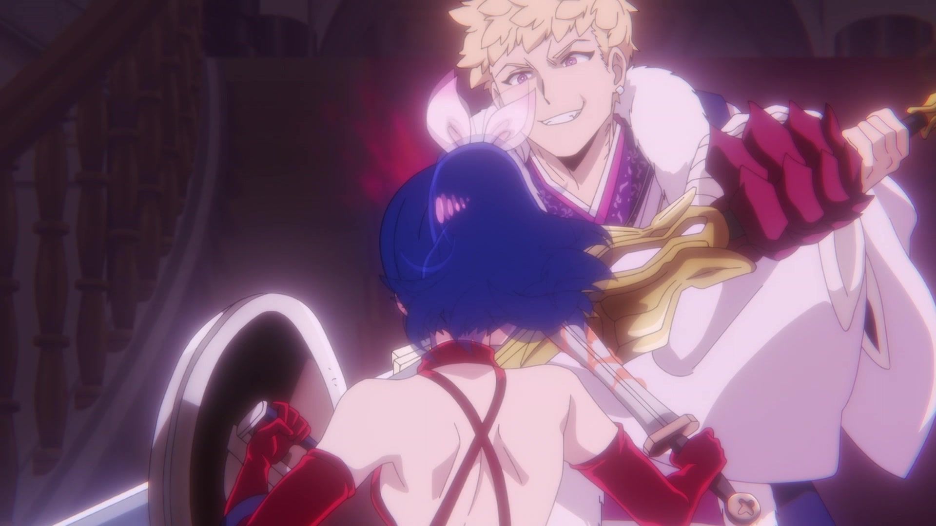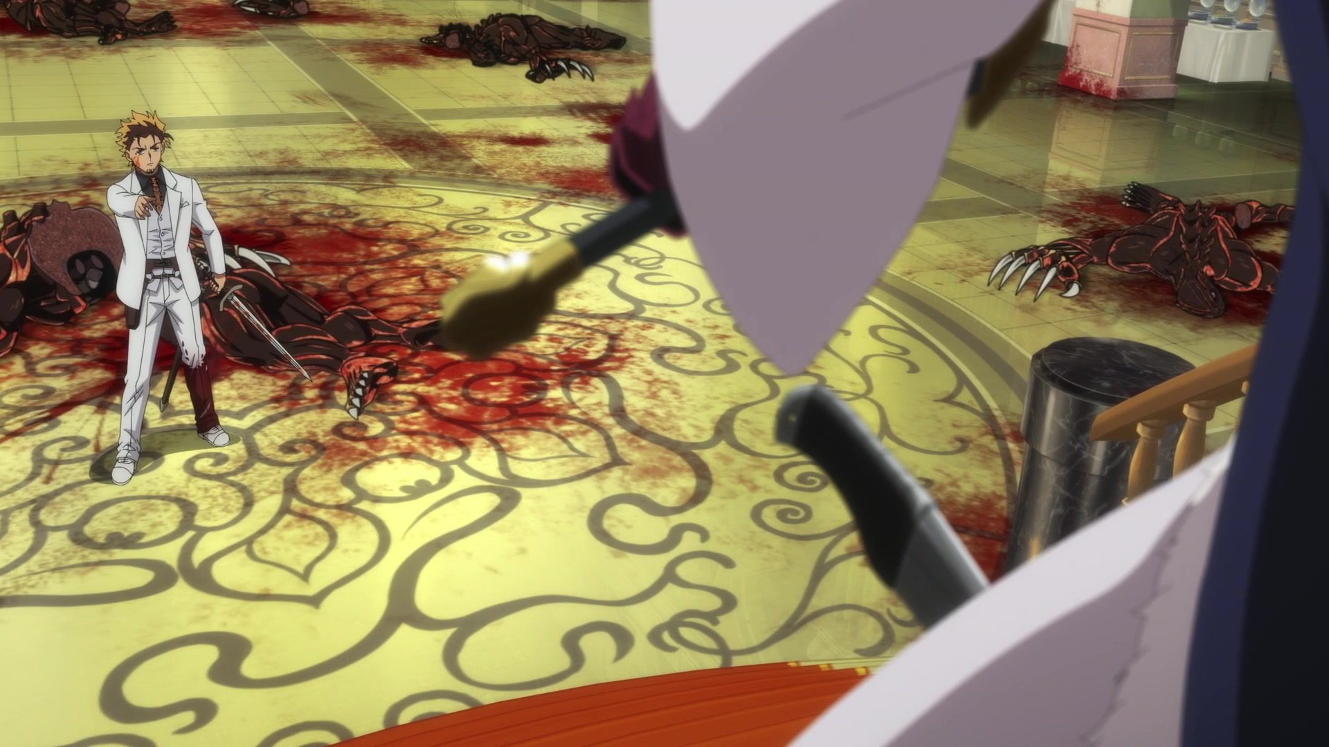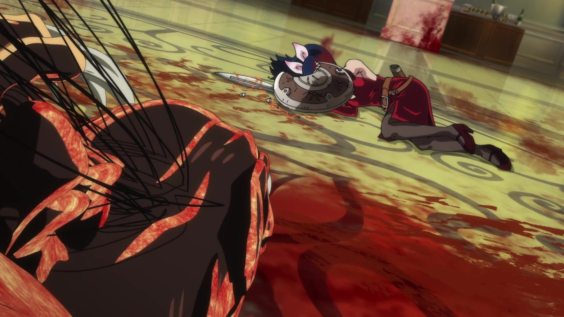 All this leading up to… just sucker punching the guy with a knife? Dude sure went down unceremoniously for all the rambling. The ten goddamned minutes of rambling. And status screens. Goddamned status screens. He got bisected by… that one still? Come on. At least make it look slightly believable. You’re only drawing about two frames anyway. Everything here was so unfathomably dumb.