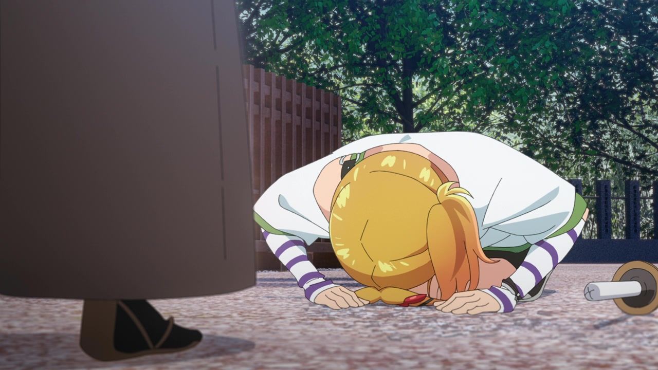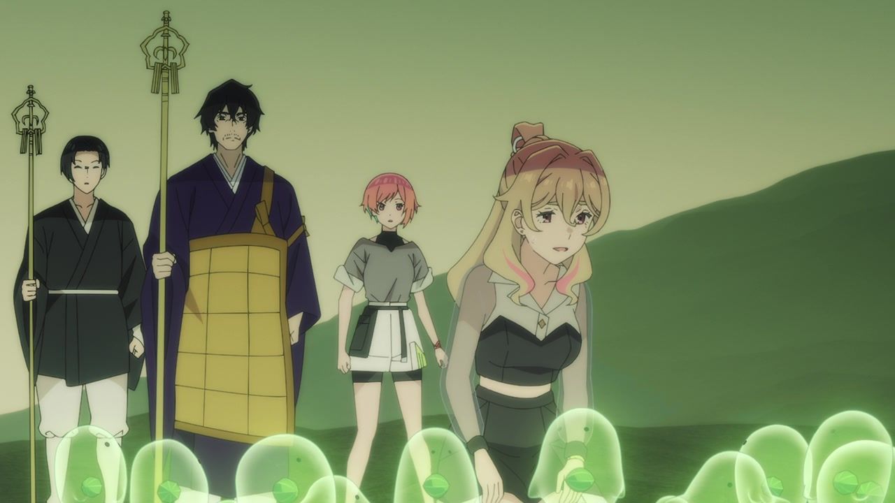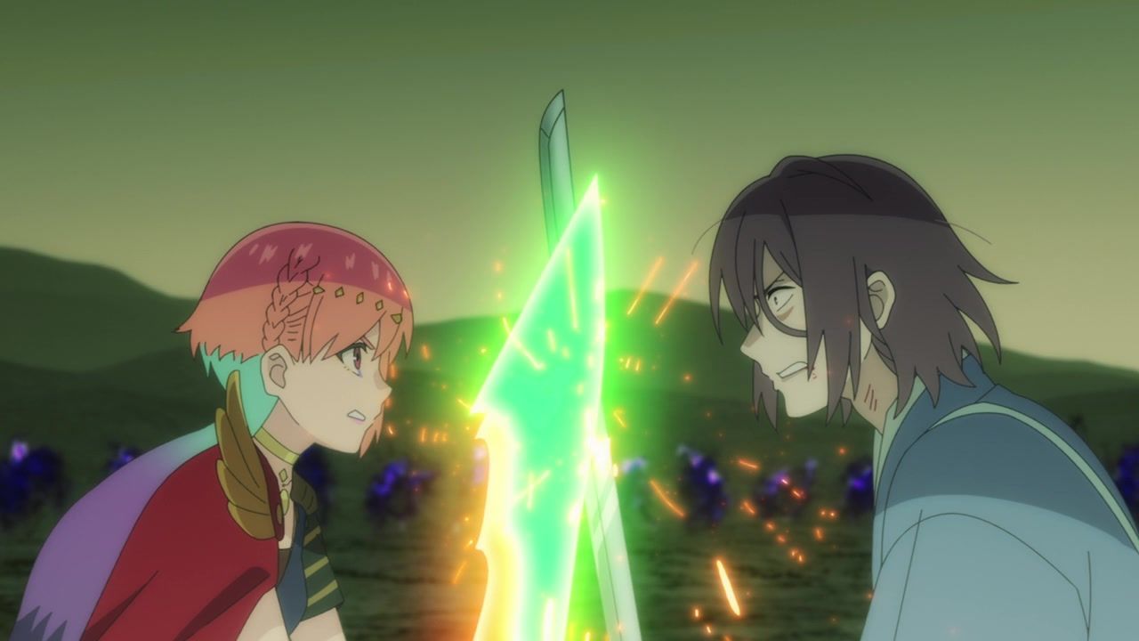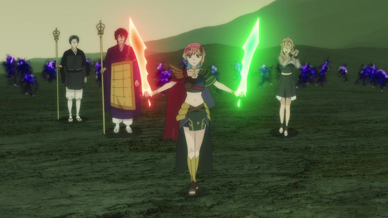 So still not anything approaching good, but unhinged in at least ways that baffle me instead of make me want to claw my cerebellum out from tedious repetition. The biggest anchor remains the terrible duet sequences, which are also meant to be the unique selling point and draw. Or at least the side hustle that they’re selling. You’d think more effort would go into highlighting those and making them part of the narrative instead of being treated like a black box where things get resolved essentially off-screen. Bizarrely at that, as the Shinsengumi dude all of a sudden gives up his metaphorical stabbings and instead starts grooving in place. Who could possibly think that looks good?